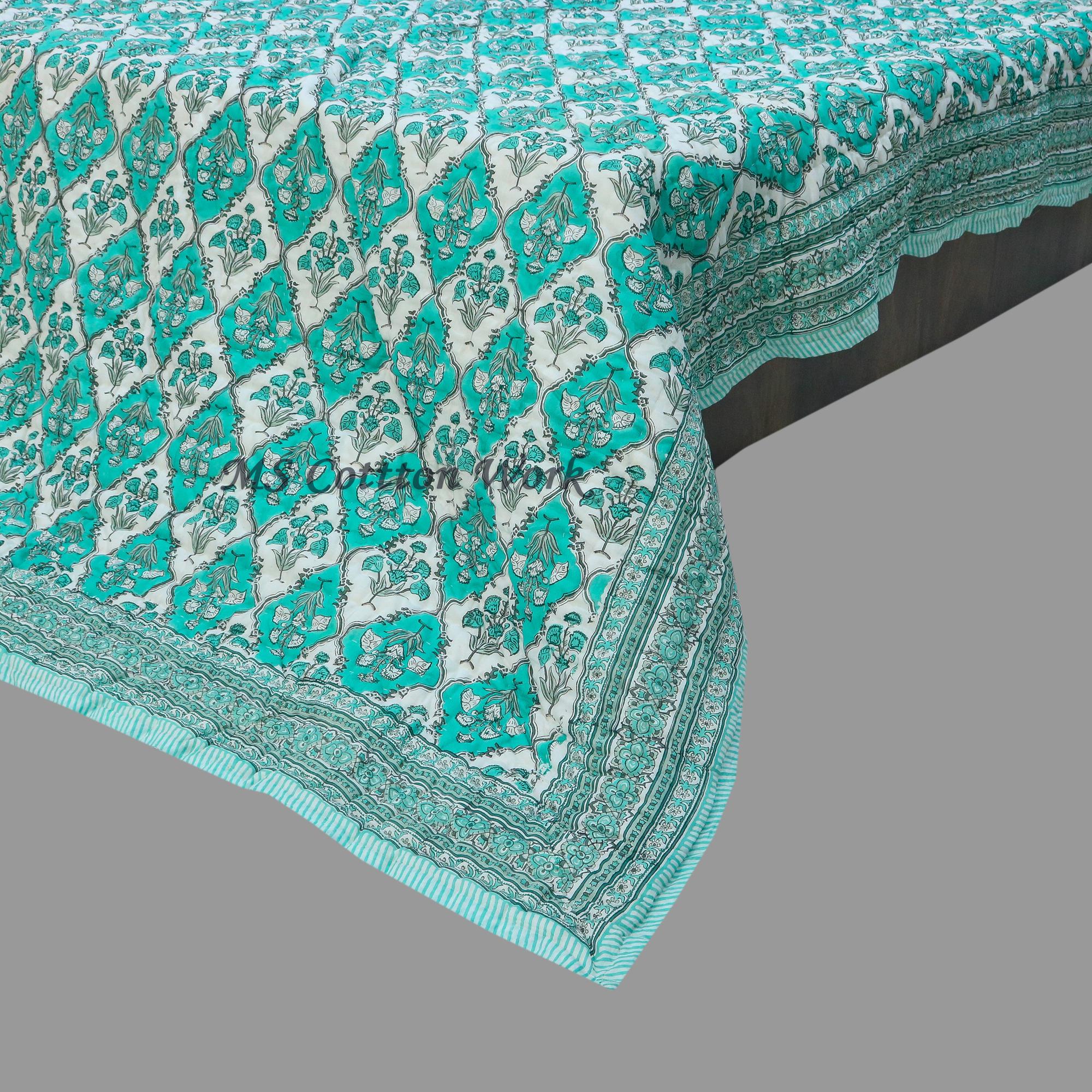 Hand Block Print Cotton Quilt: Reversible Floral Bedspread