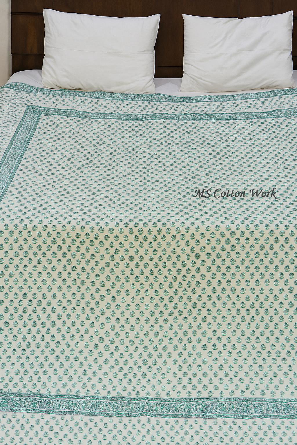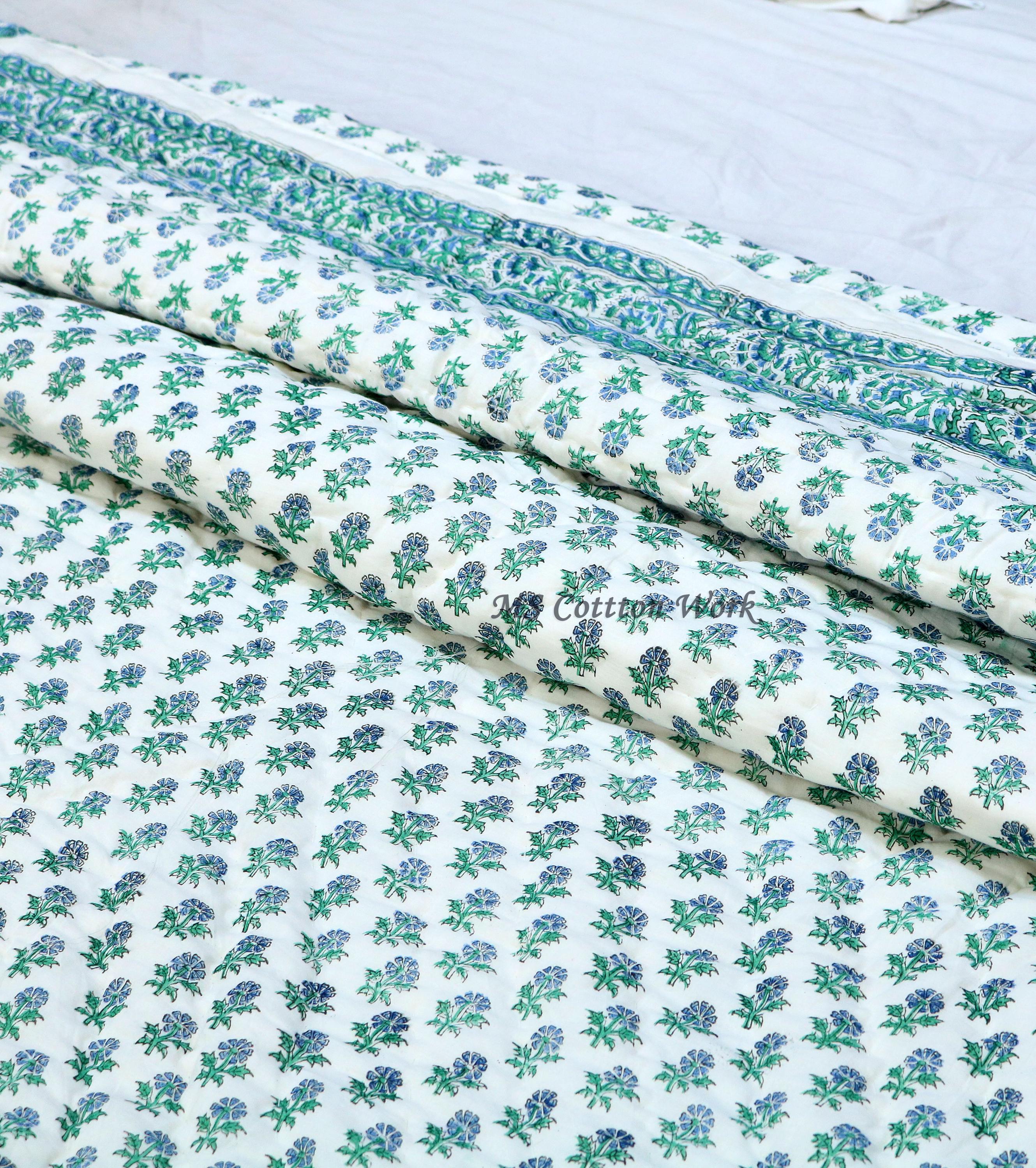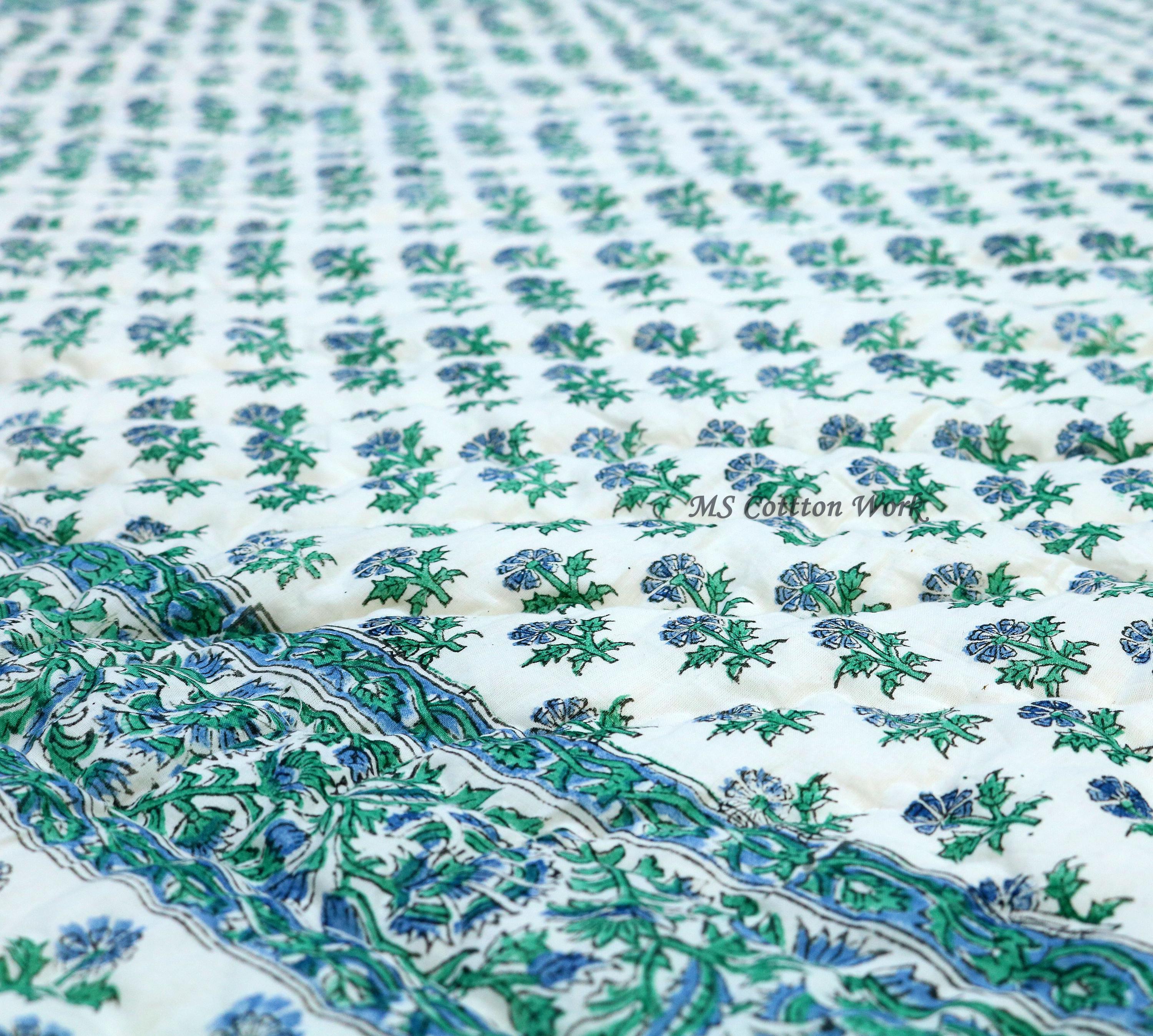 Hand Block Printed Cotton Quilt: Lightweight Green Floral Bedspread