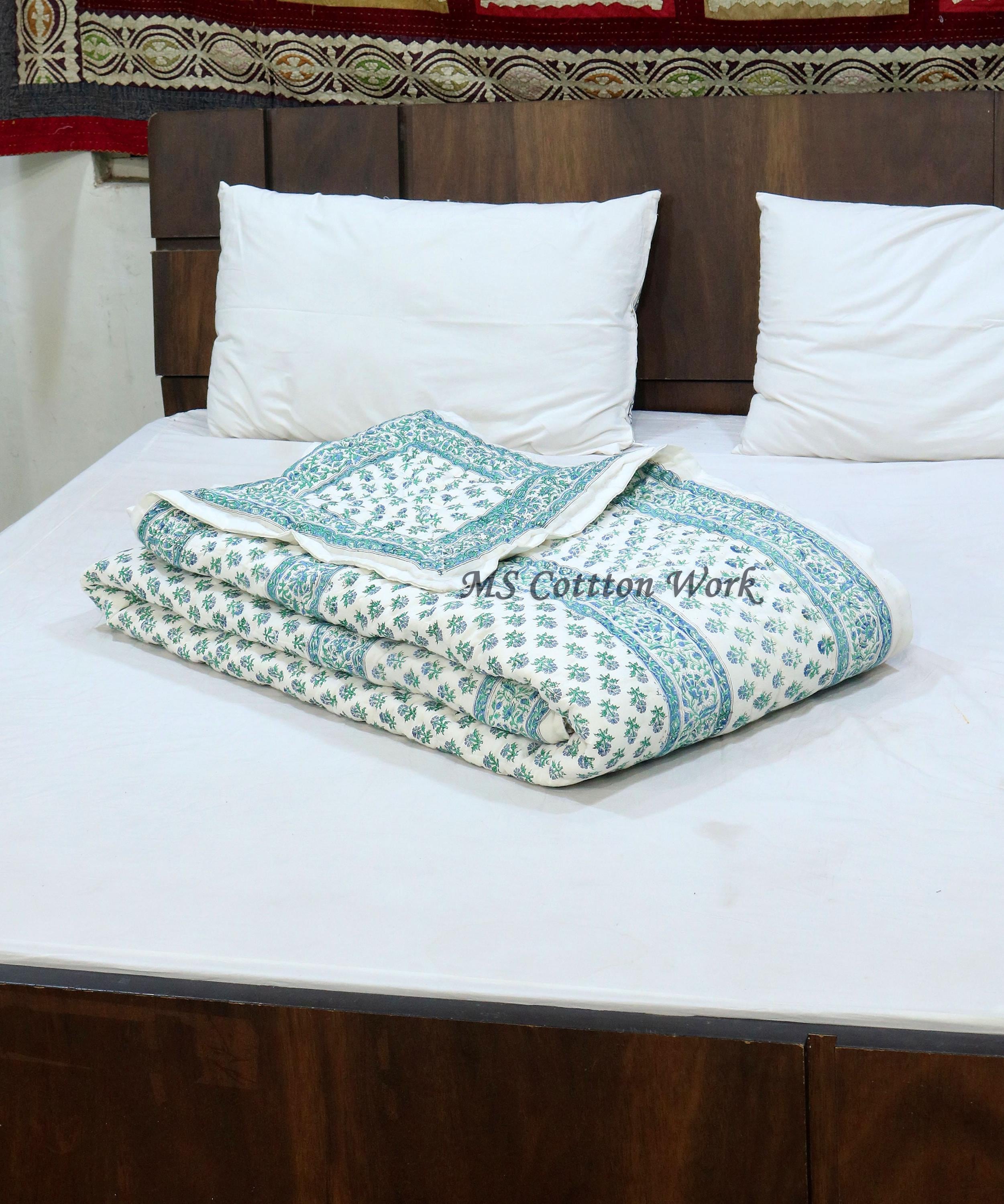 Wrap yourself in warmth and luxury with our Hand Block Printed Quilt, featuring intricate hand block printing on soft Malmal cotton fabric. Filled with natural loose cotton, it offers unparalleled comfort and coziness, perfect for colder seasons. Meticulously hand-stitched throughout, the quilt's unique design adds a touch of artistry and charm to your bedroom.