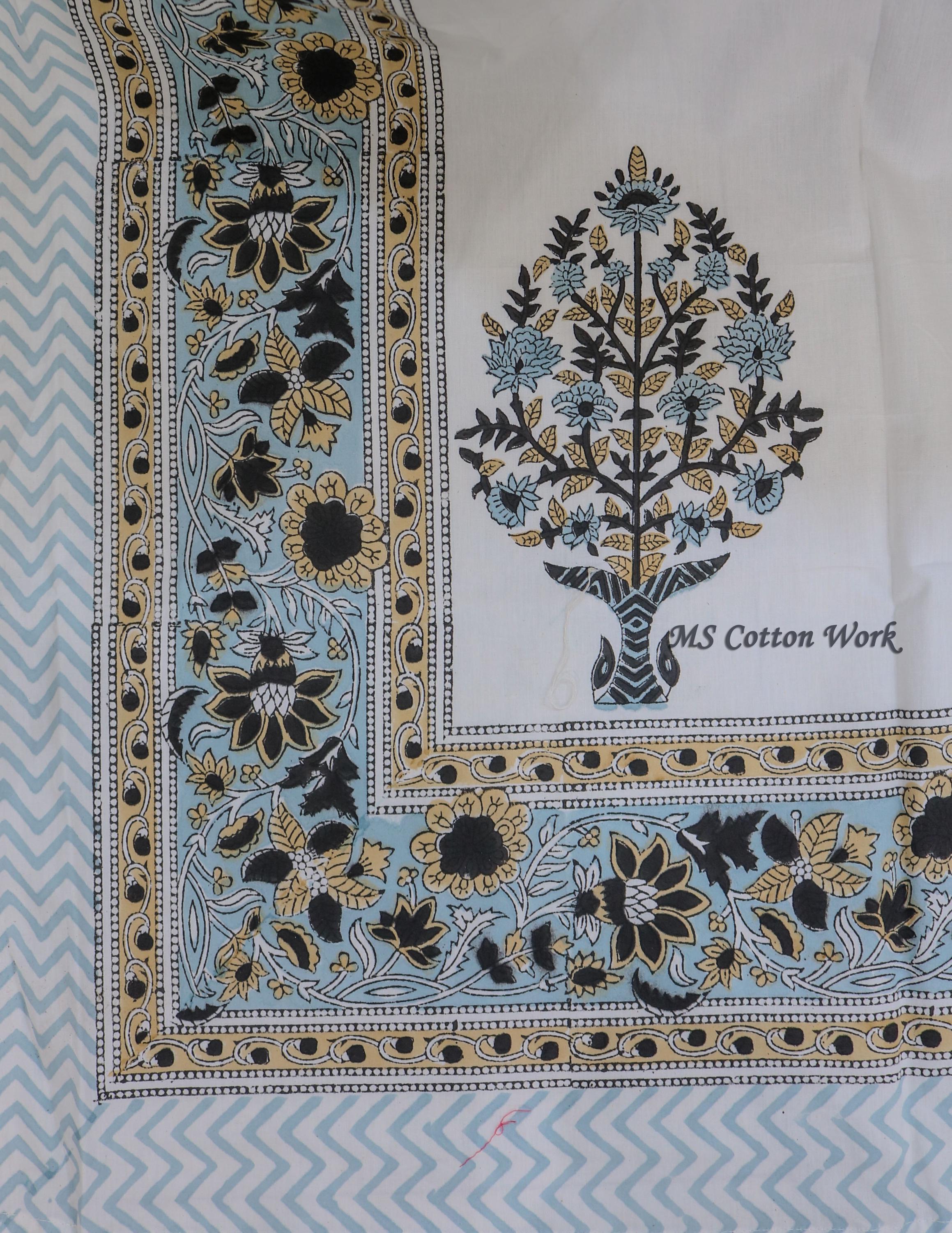 Hand Block Printing: Skilled artisans carve intricate designs onto wooden blocks, which are then dipped in natural dyes and stamped onto the fabric with precision. This ancient technique results in unique patterns and vibrant colors that are characteristic of hand block printing.