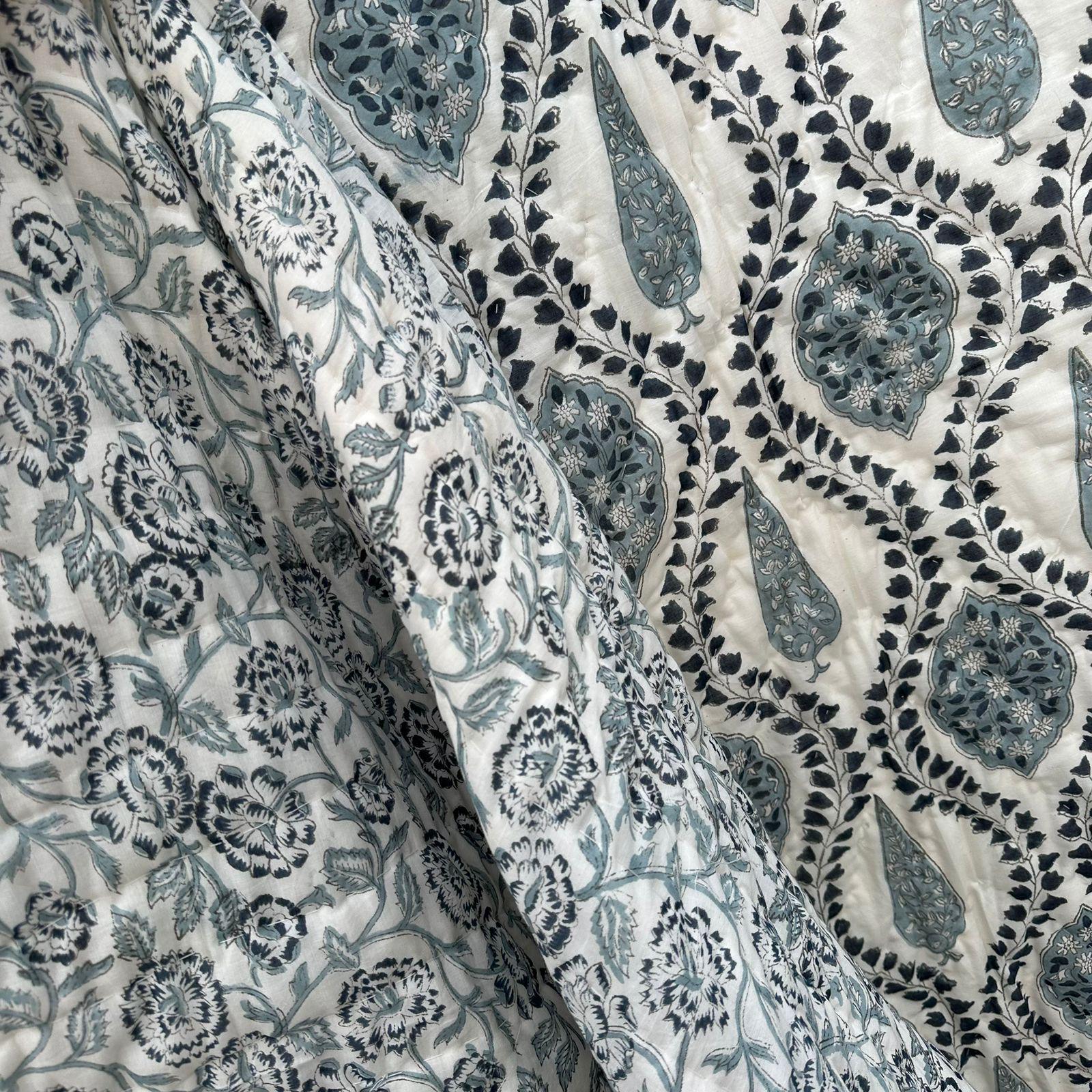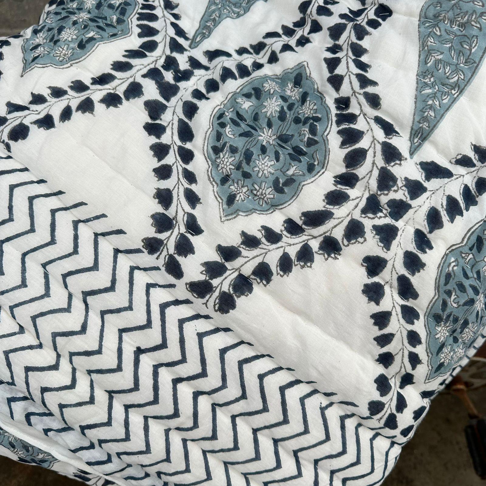Jaipur Block Printed Quilt | Reversible Cotton Blanket | Modern Mughal Floral Leaves Design