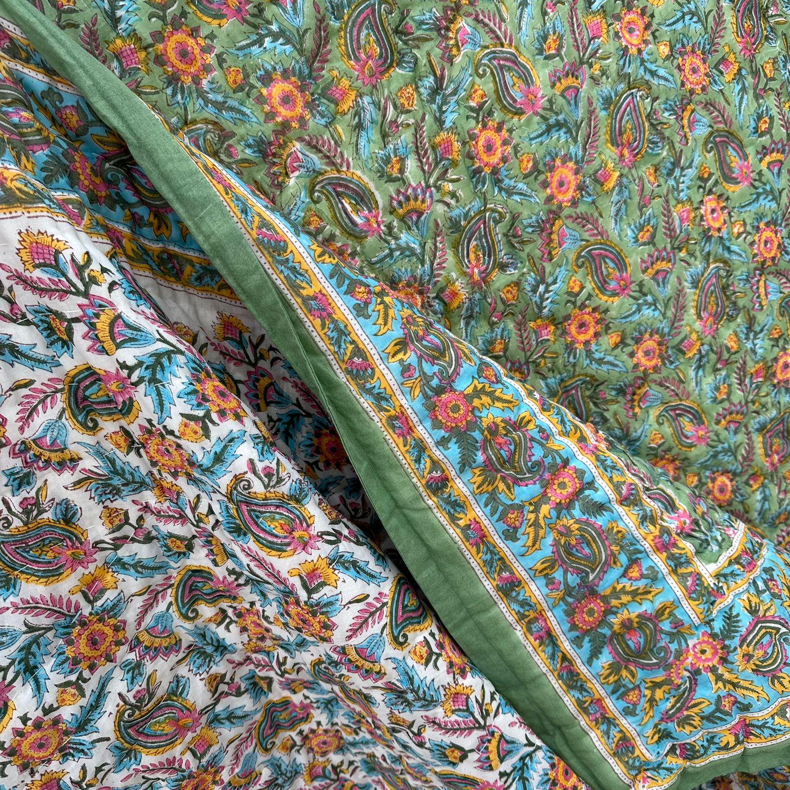 Hand Block Print Cotton Quilt: Floral Paisley Indian Bedding