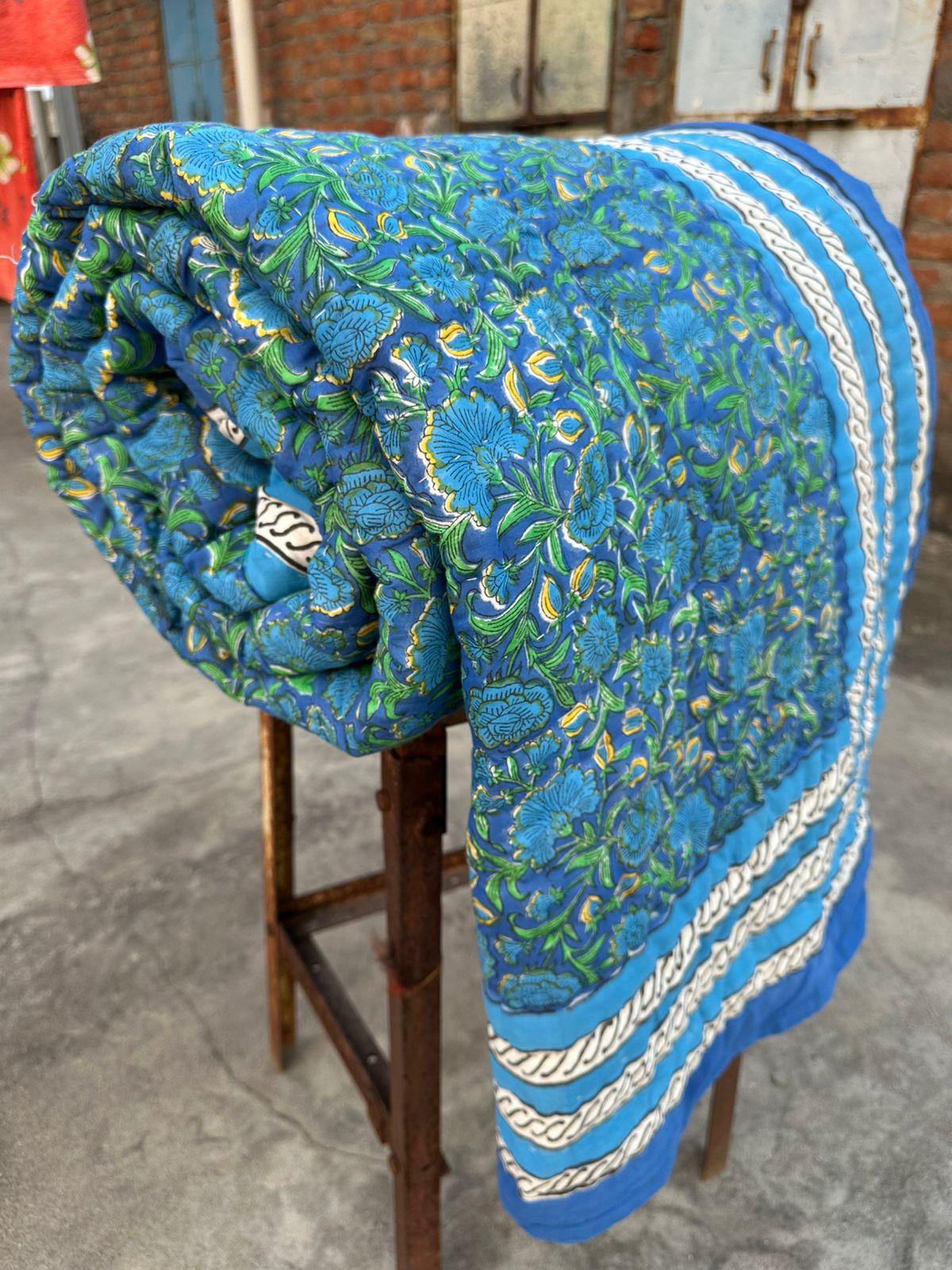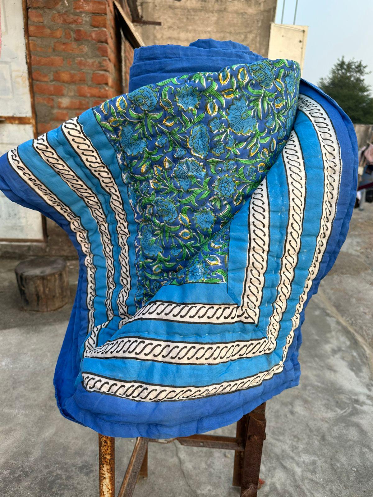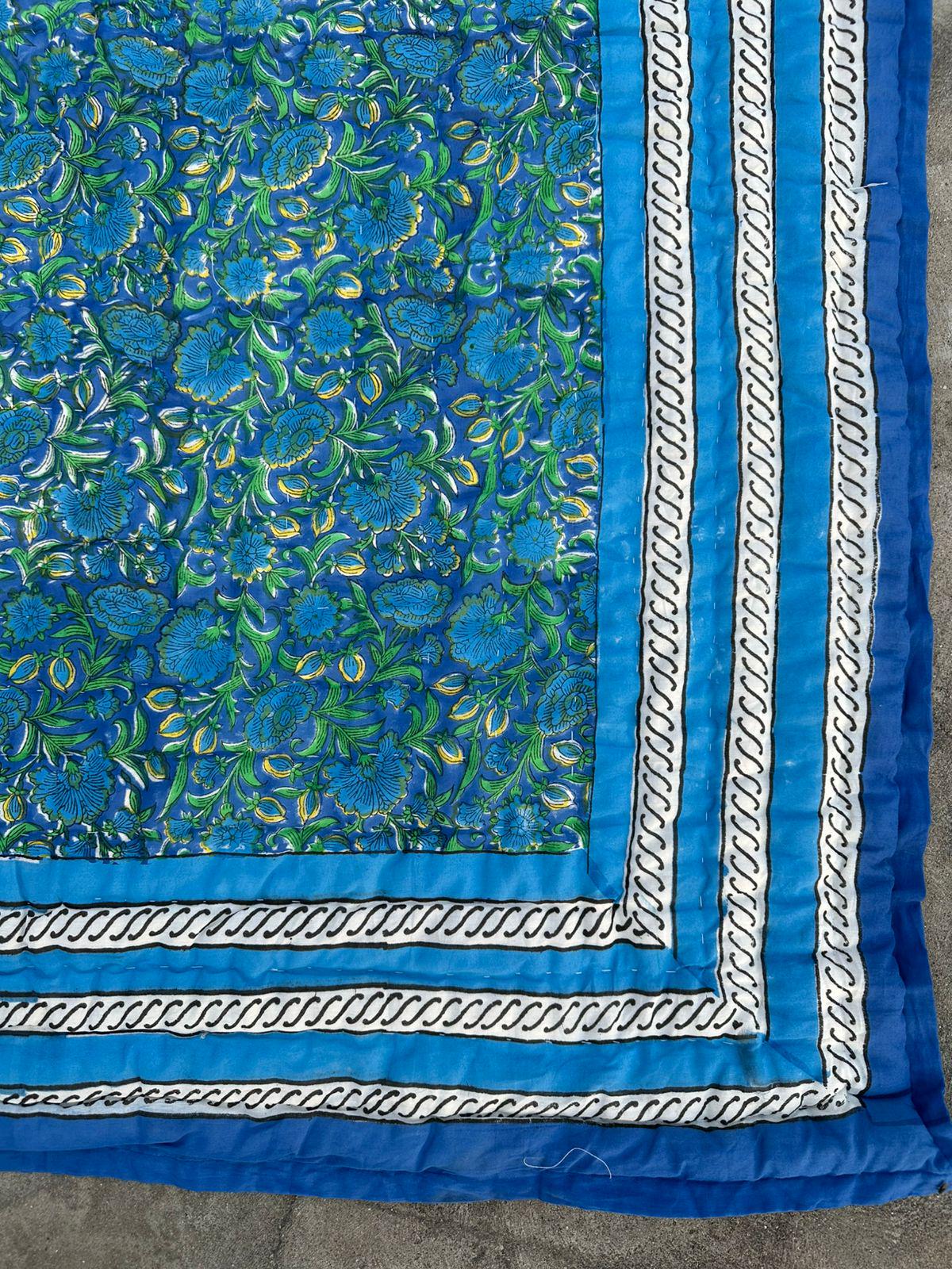 Blue Floral Hand Block Print Cotton Quilt, Reversible Indian Dohar