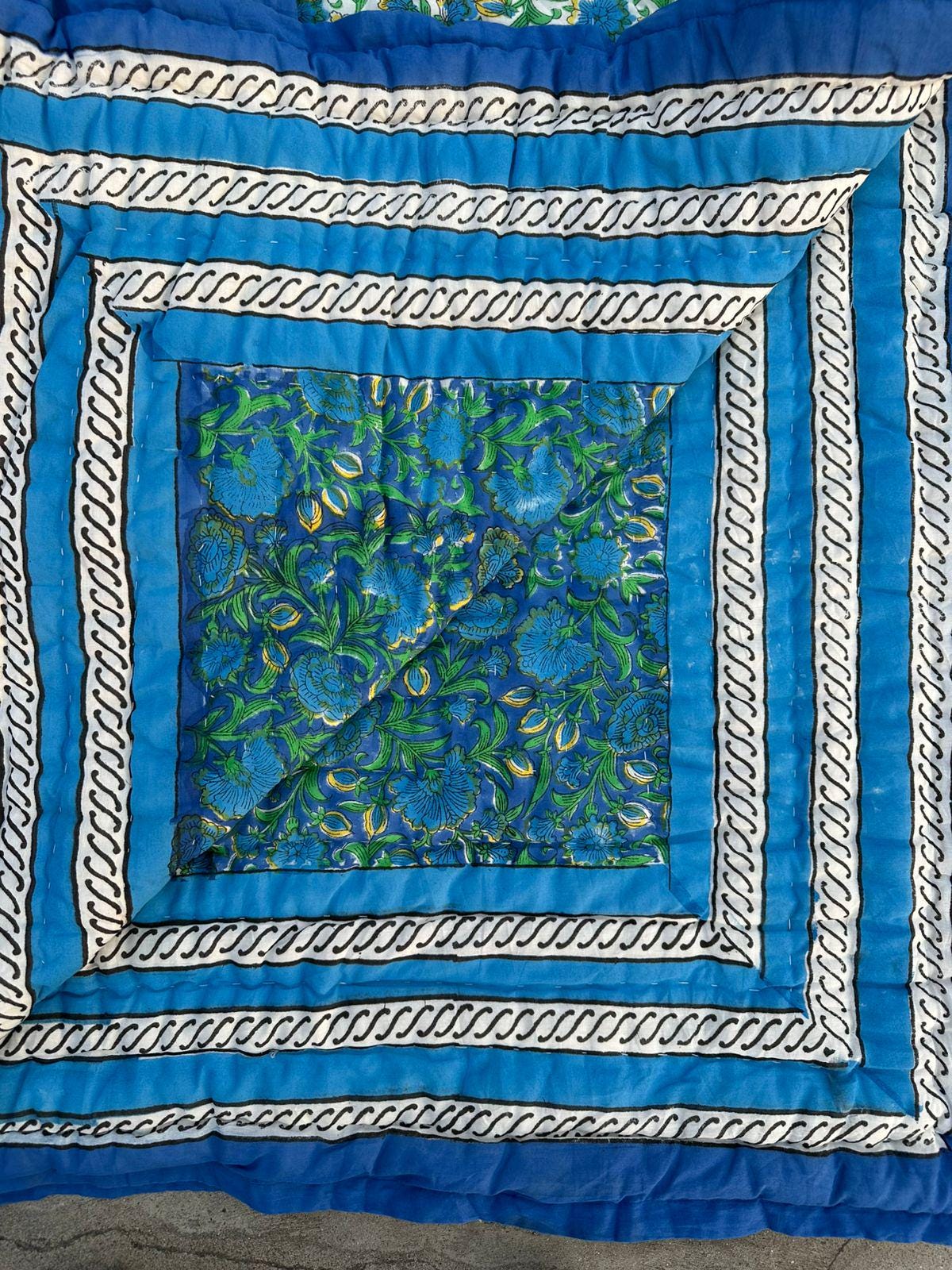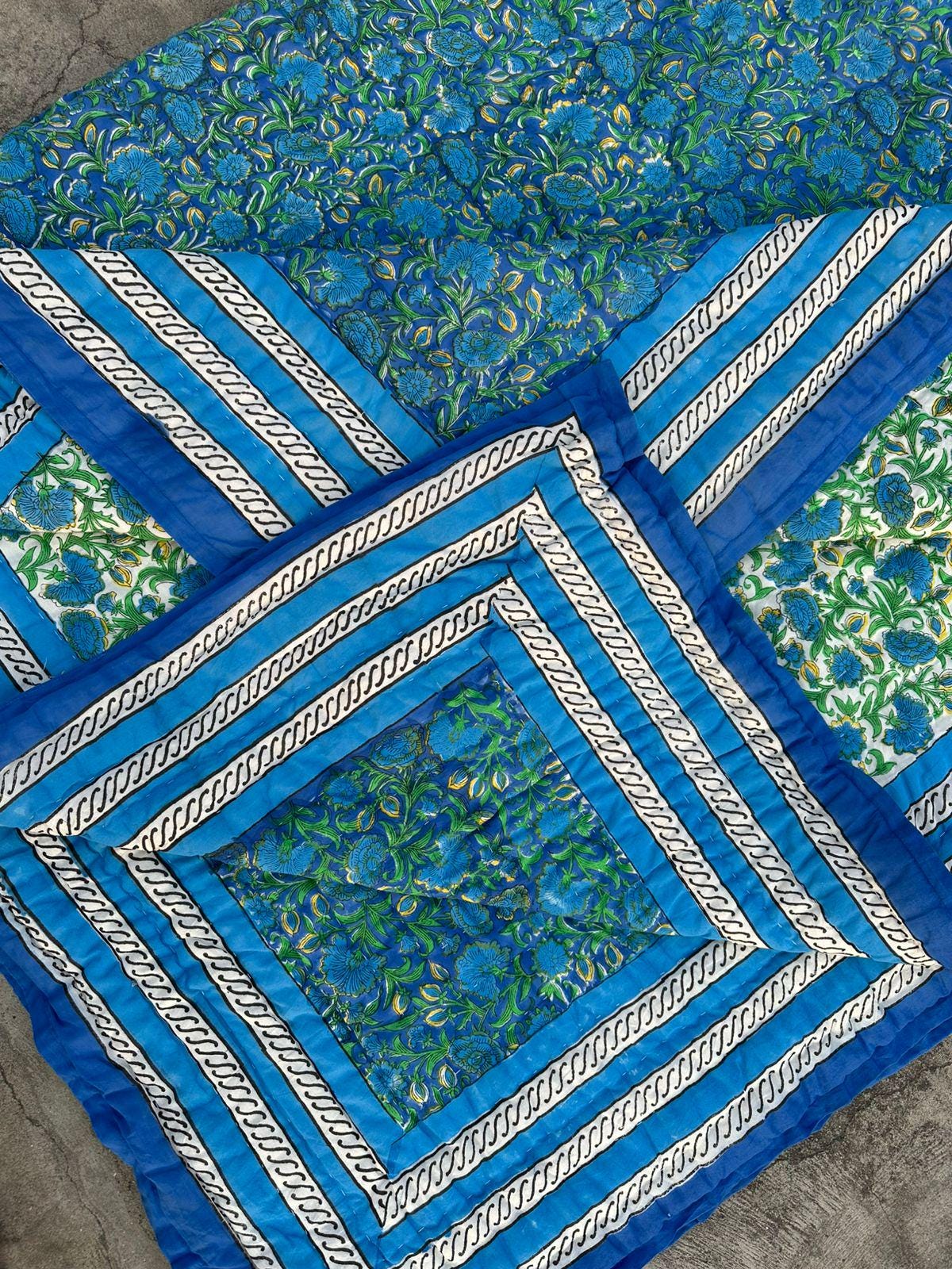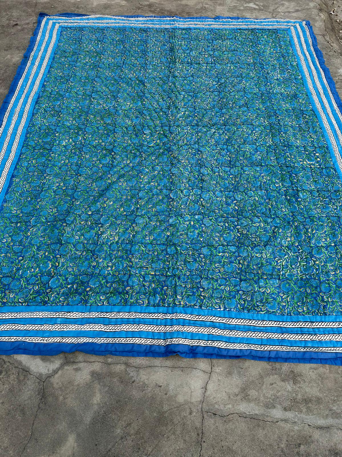 Blue Floral Hand Block Print Cotton Quilt, Reversible Indian Dohar