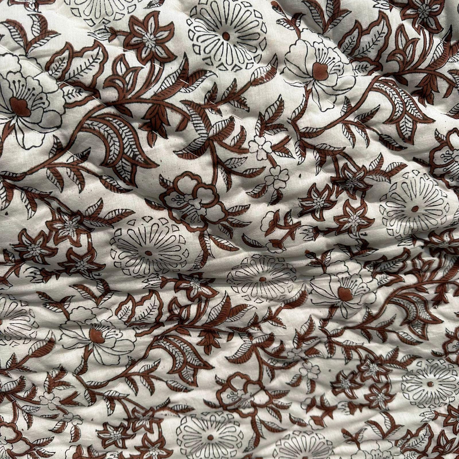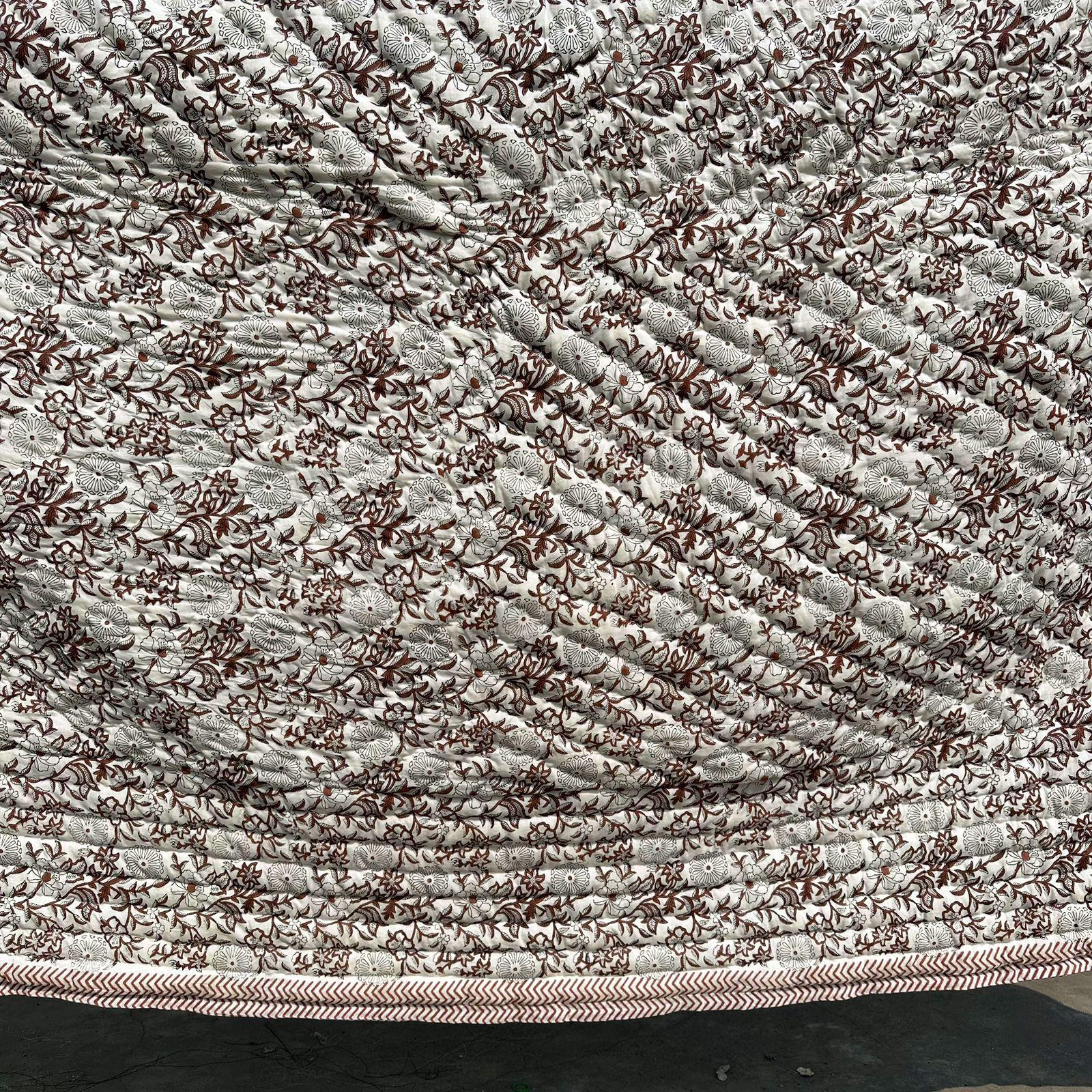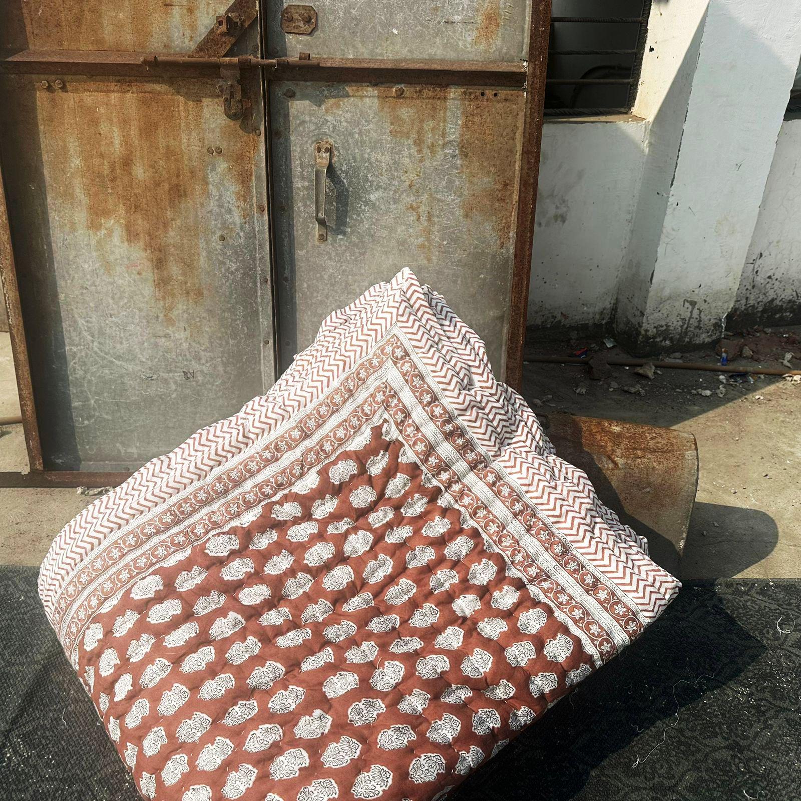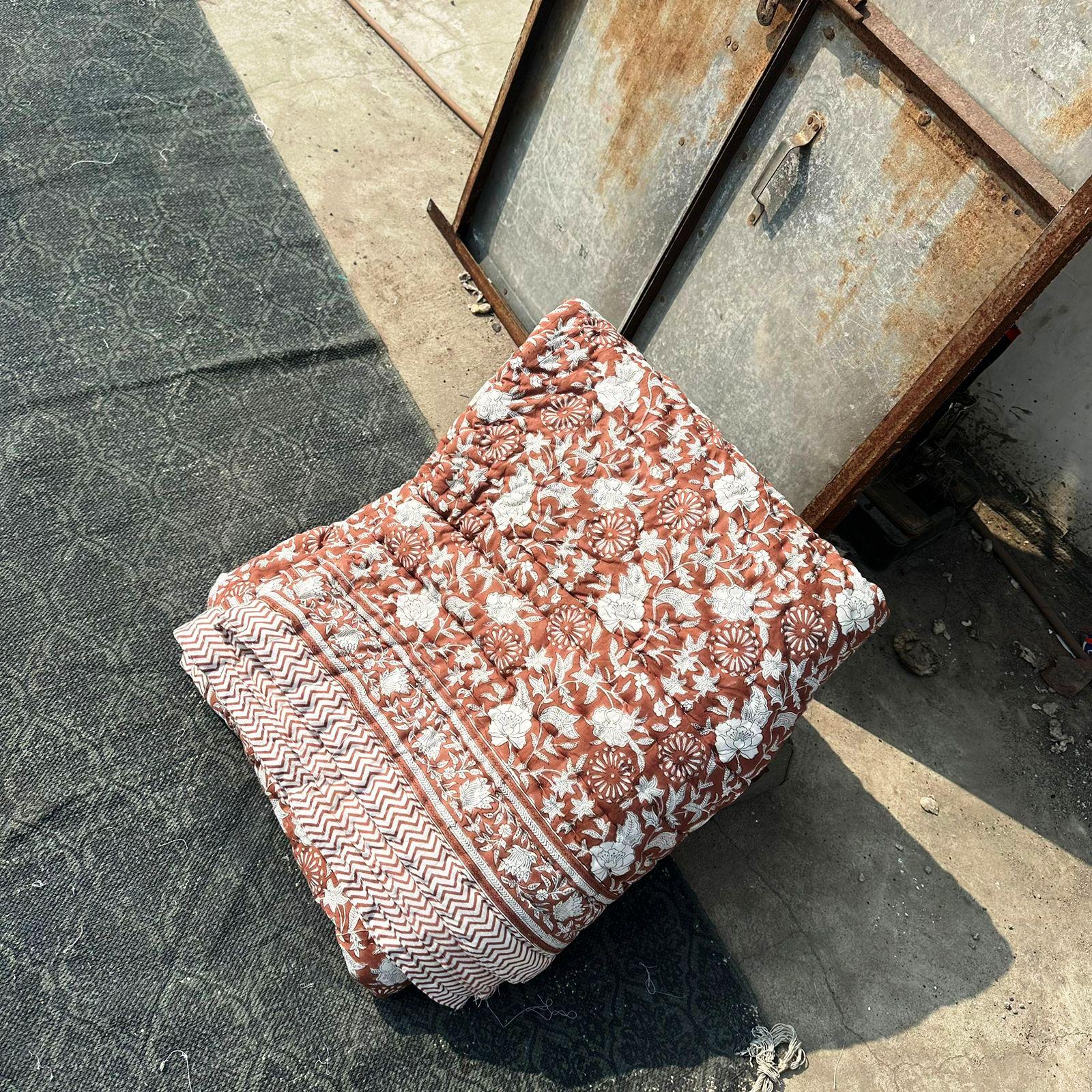Wrap yourself in warmth and luxury with our Hand Block Printed Quilt, featuring intricate hand block printing on soft Malmal cotton fabric. Filled with natural loose cotton, it offers unparalleled comfort and coziness, perfect for colder seasons. Meticulously hand-stitched throughout, the quilt's unique design adds a touch of artistry and charm to your bedroom.
