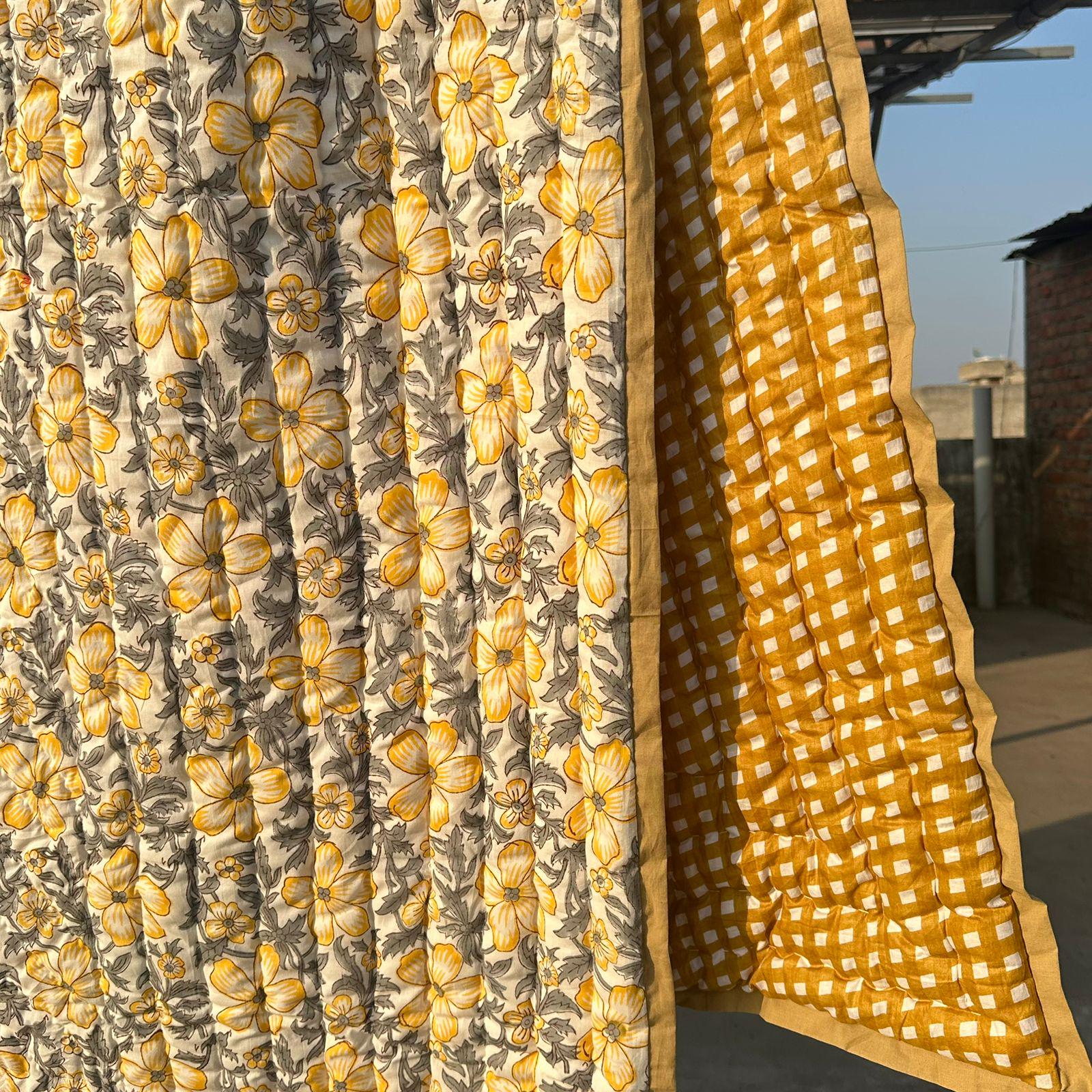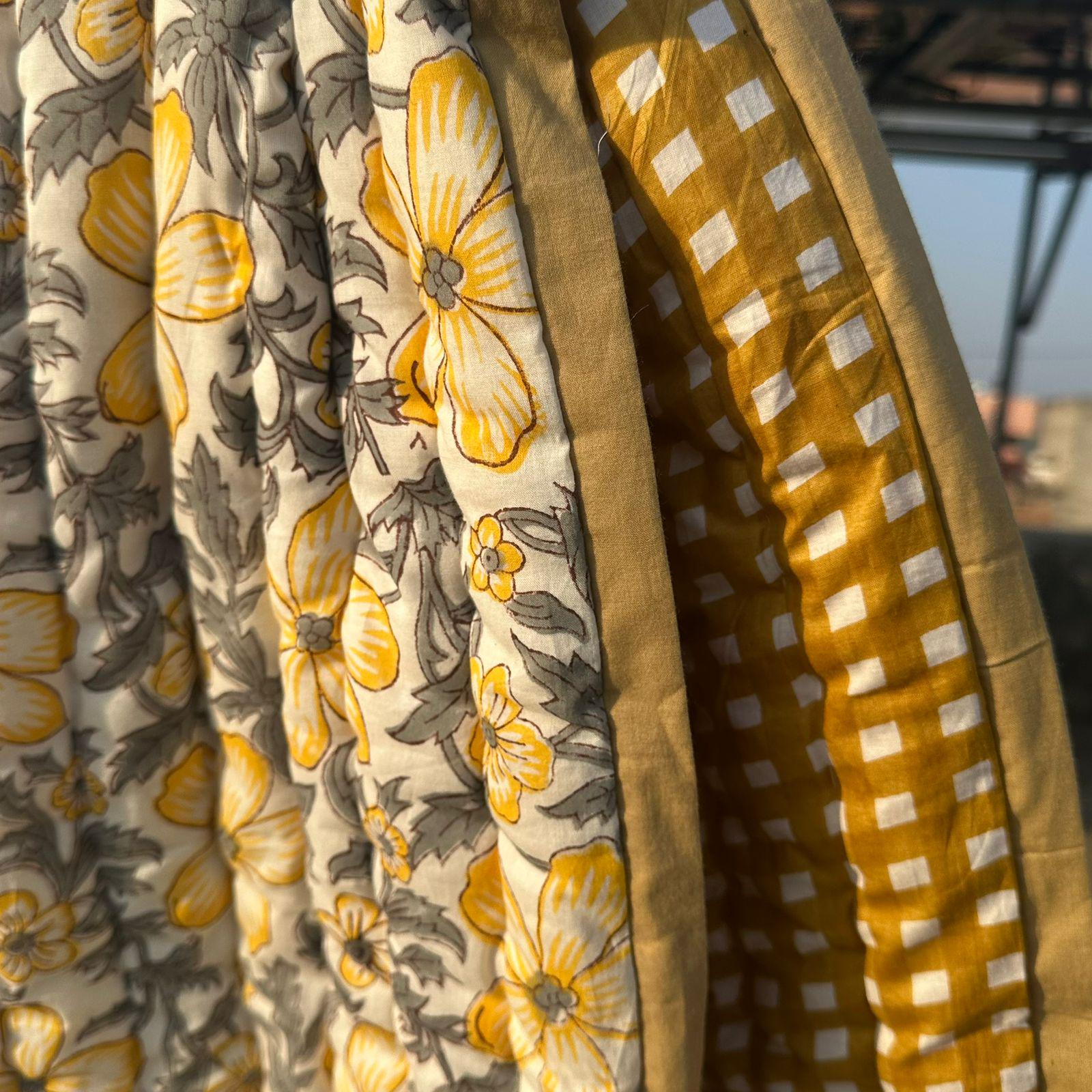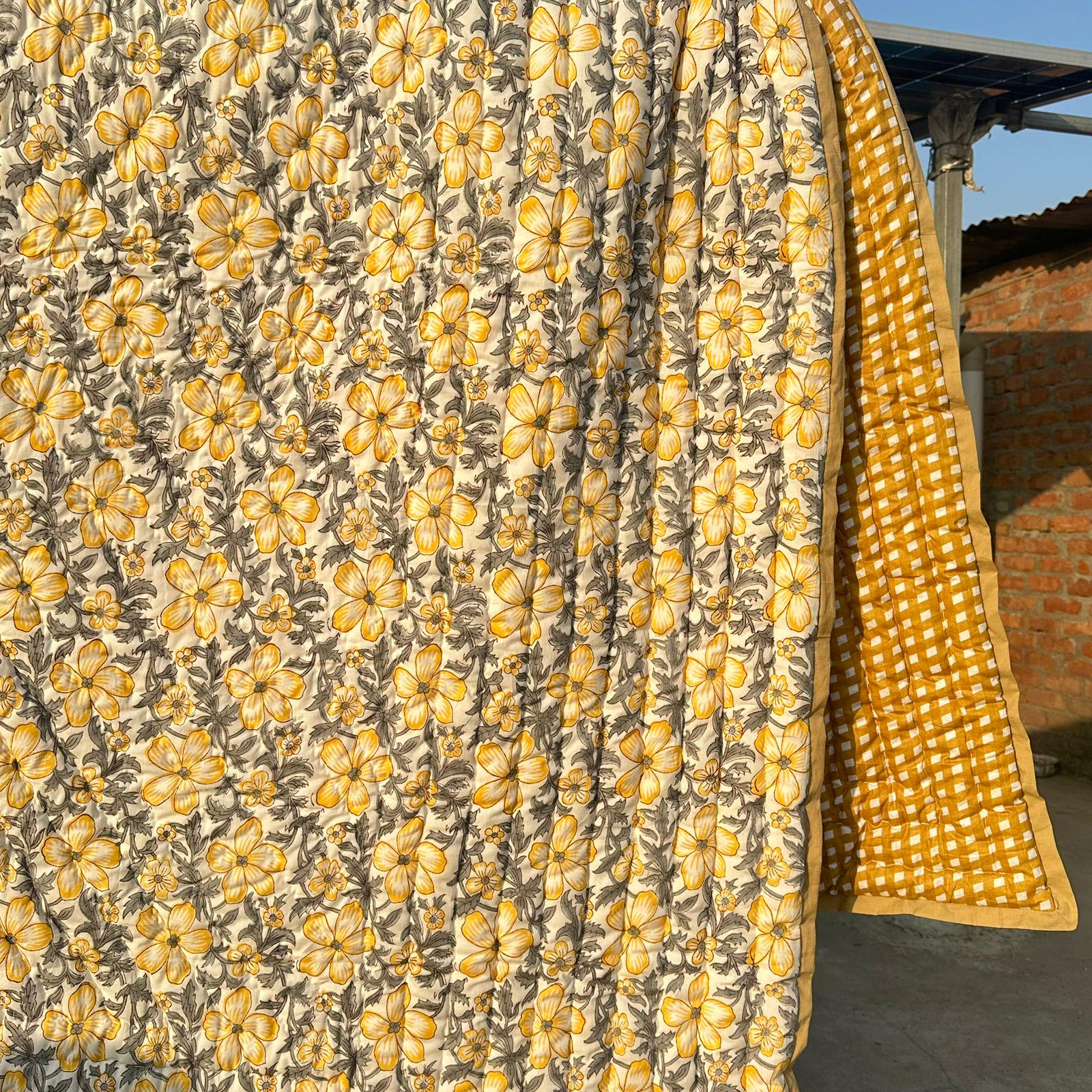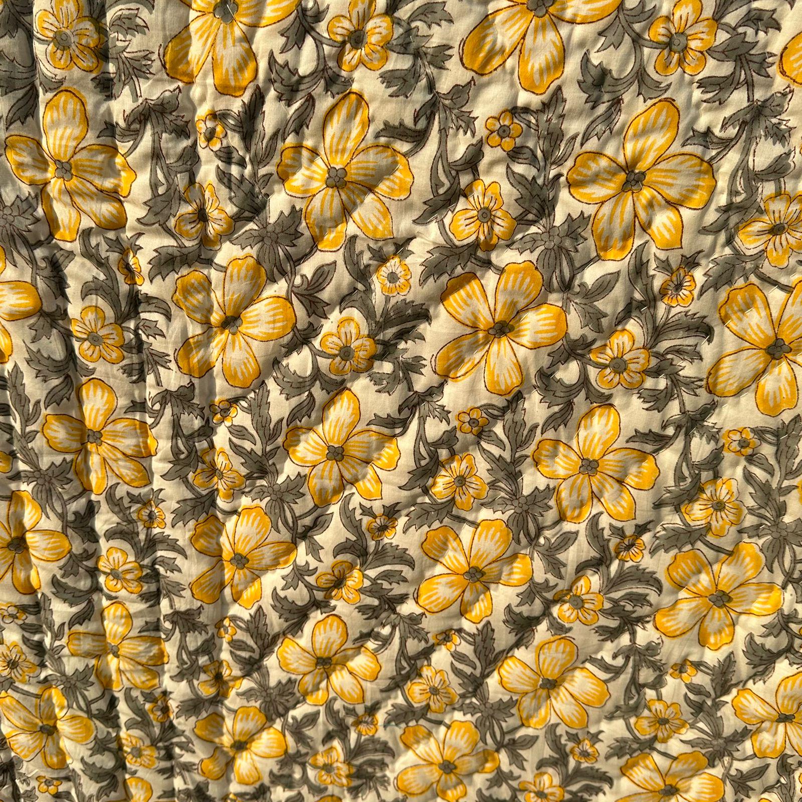 Hand Block Printed Floral Cotton Quilt: Sunshine Blooms Garden Floral Bedding