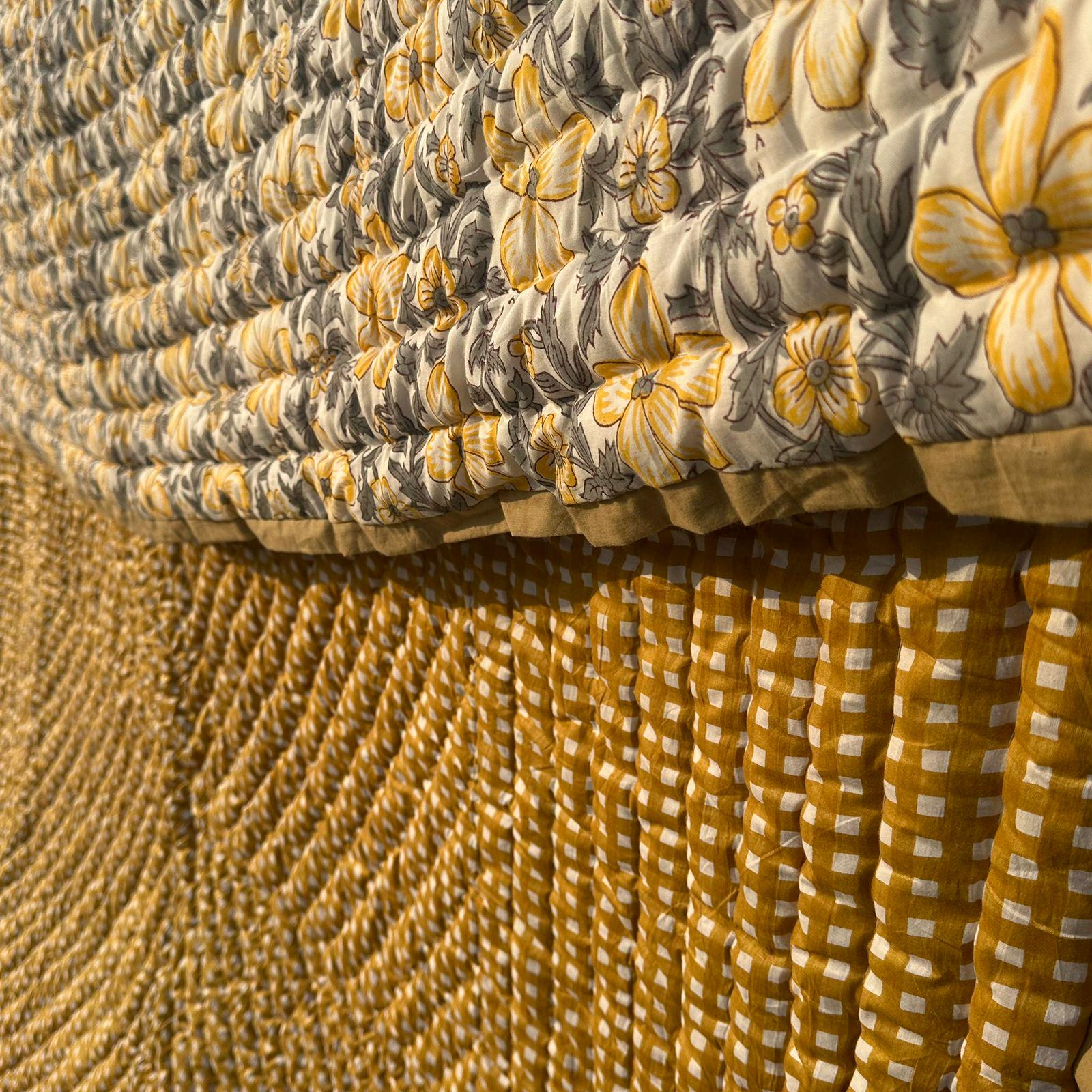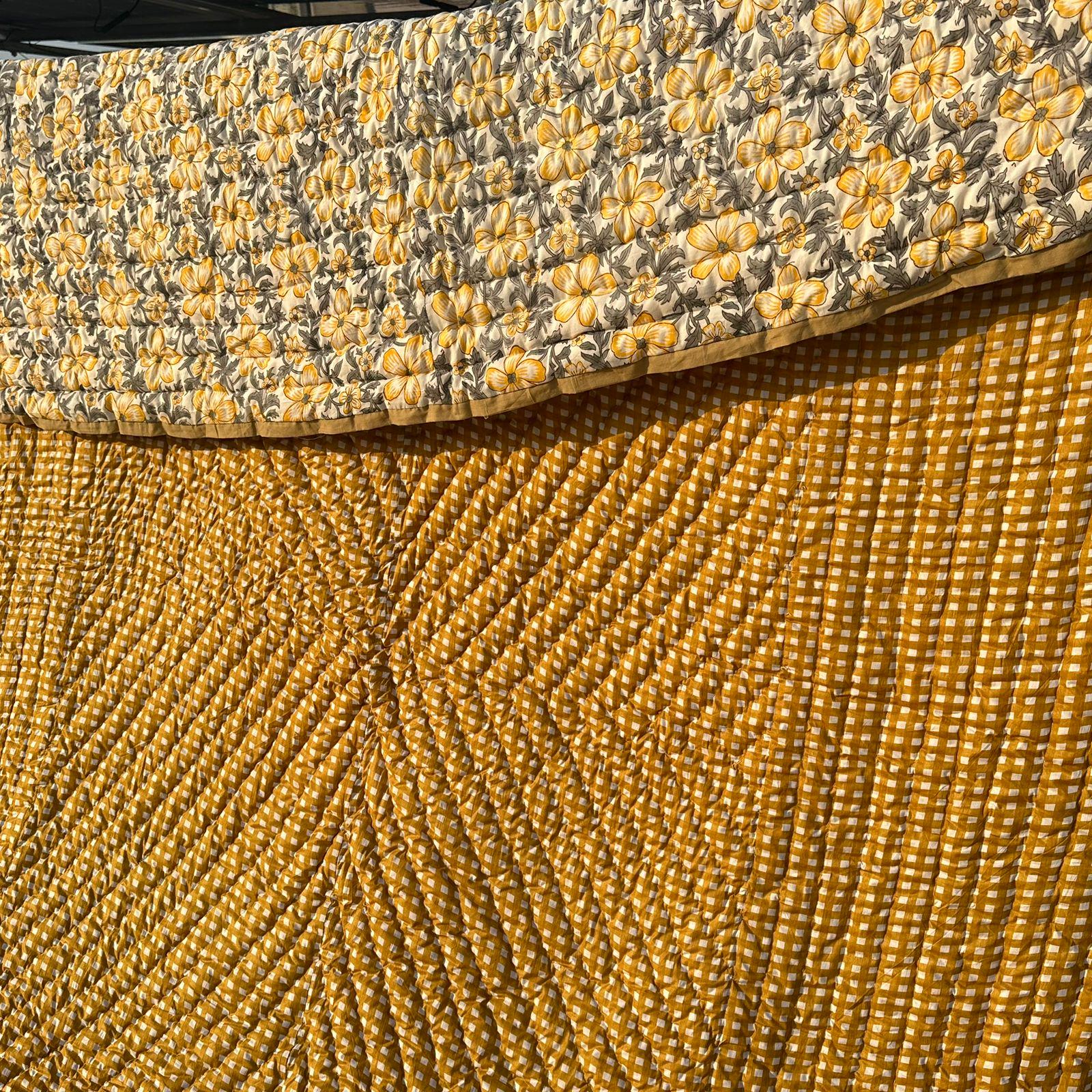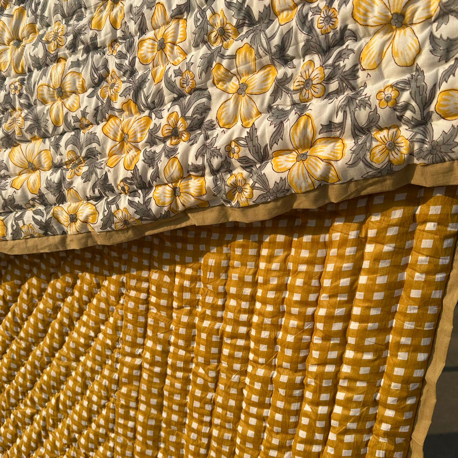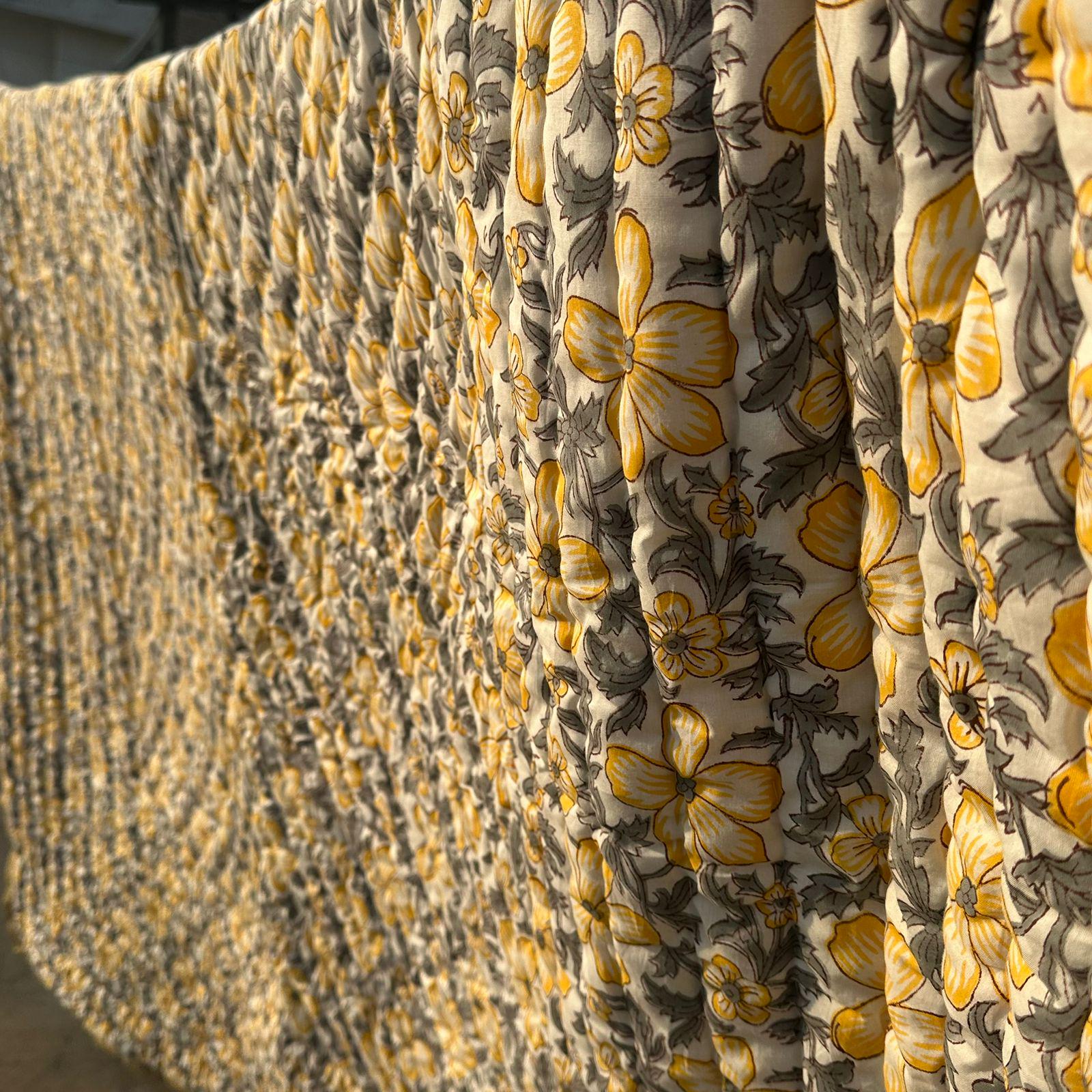 Hand Block Printed Floral Cotton Quilt: Sunshine Blooms Garden Floral Bedding