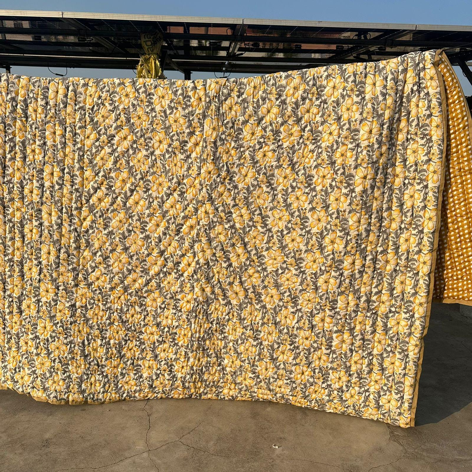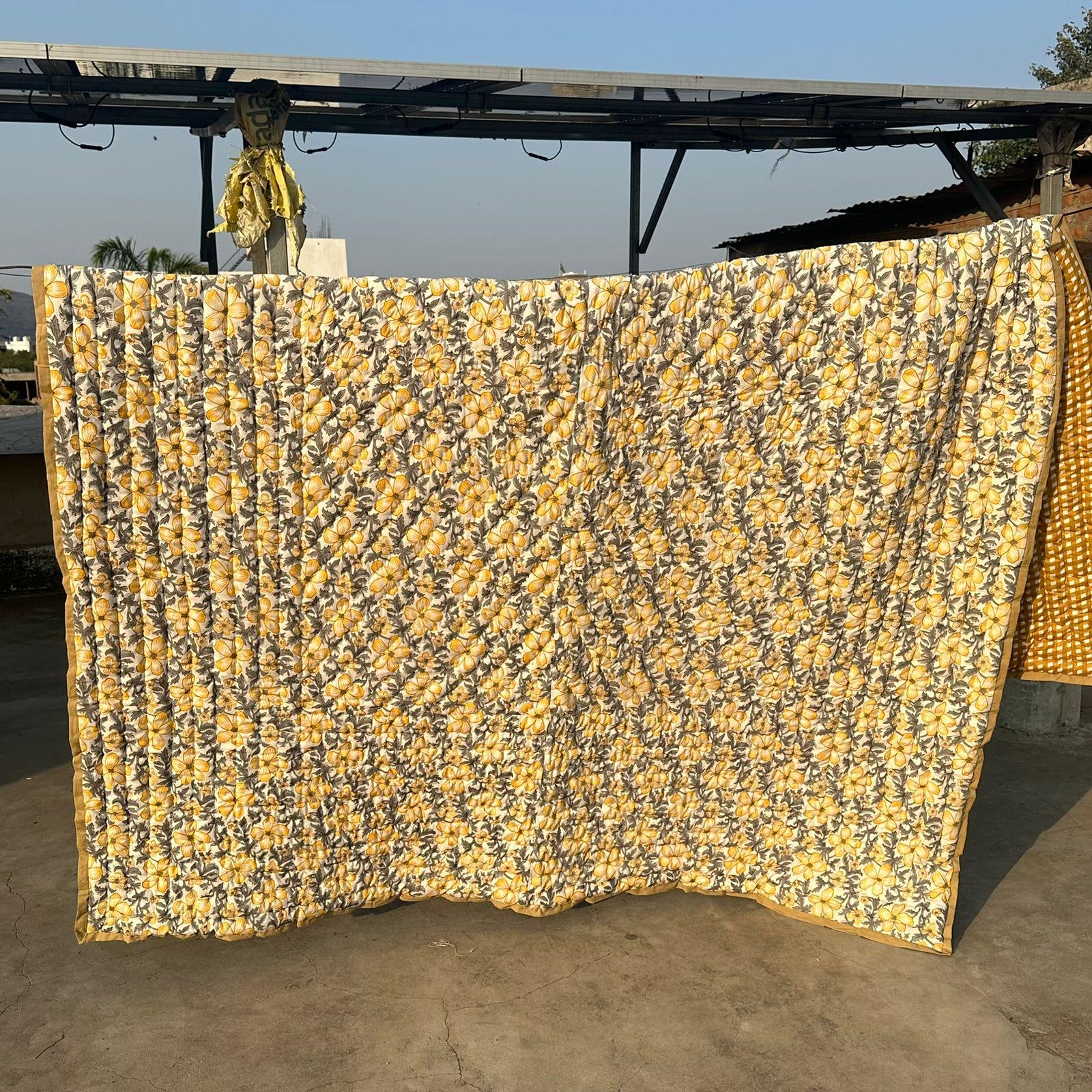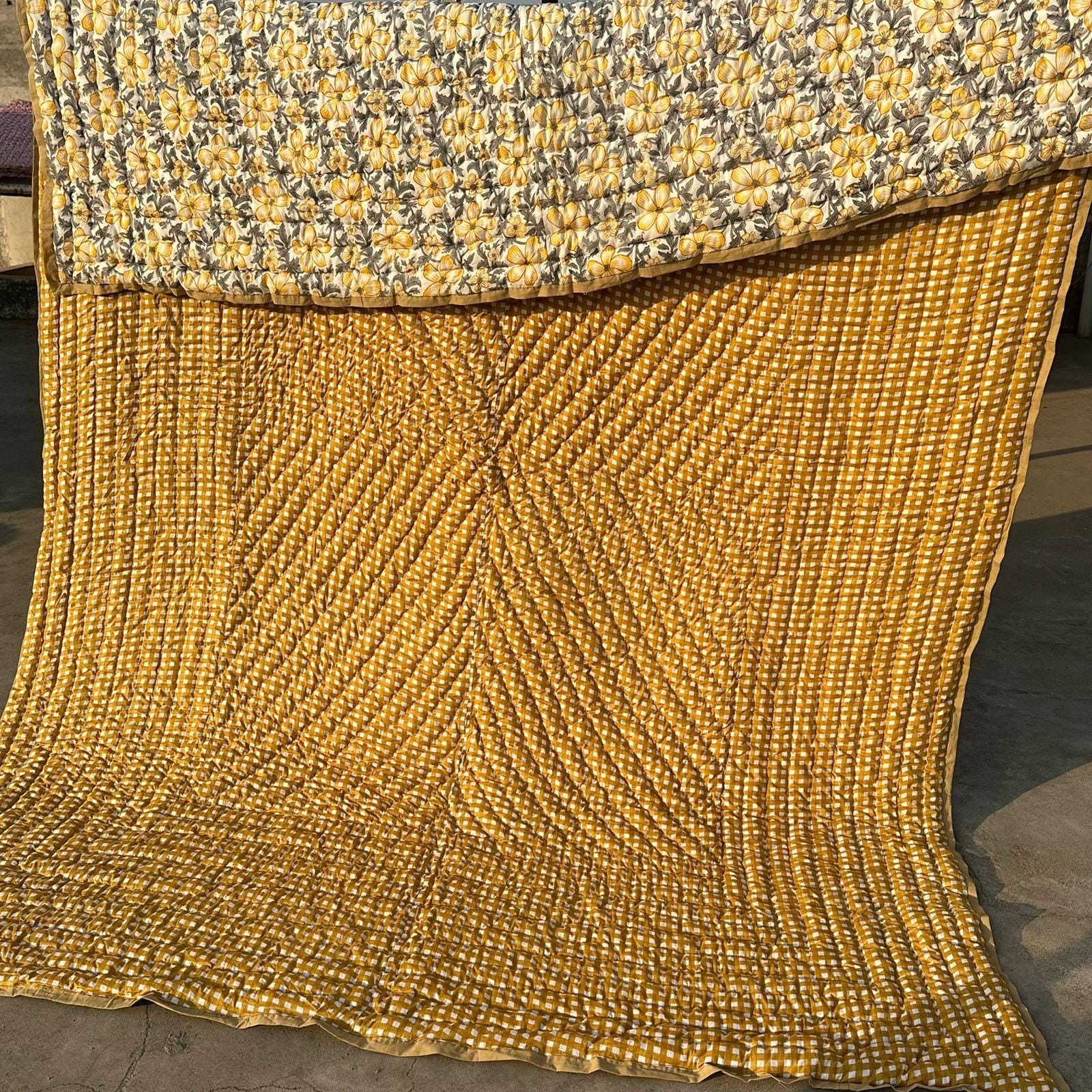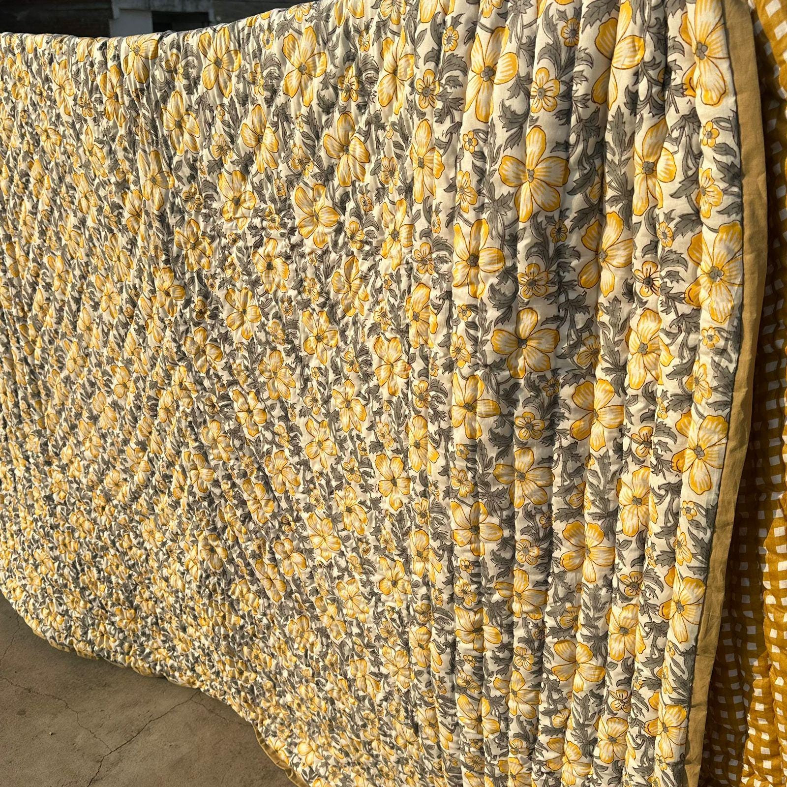 Hand Block Printed Floral Cotton Quilt: Sunshine Blooms Garden Floral Bedding