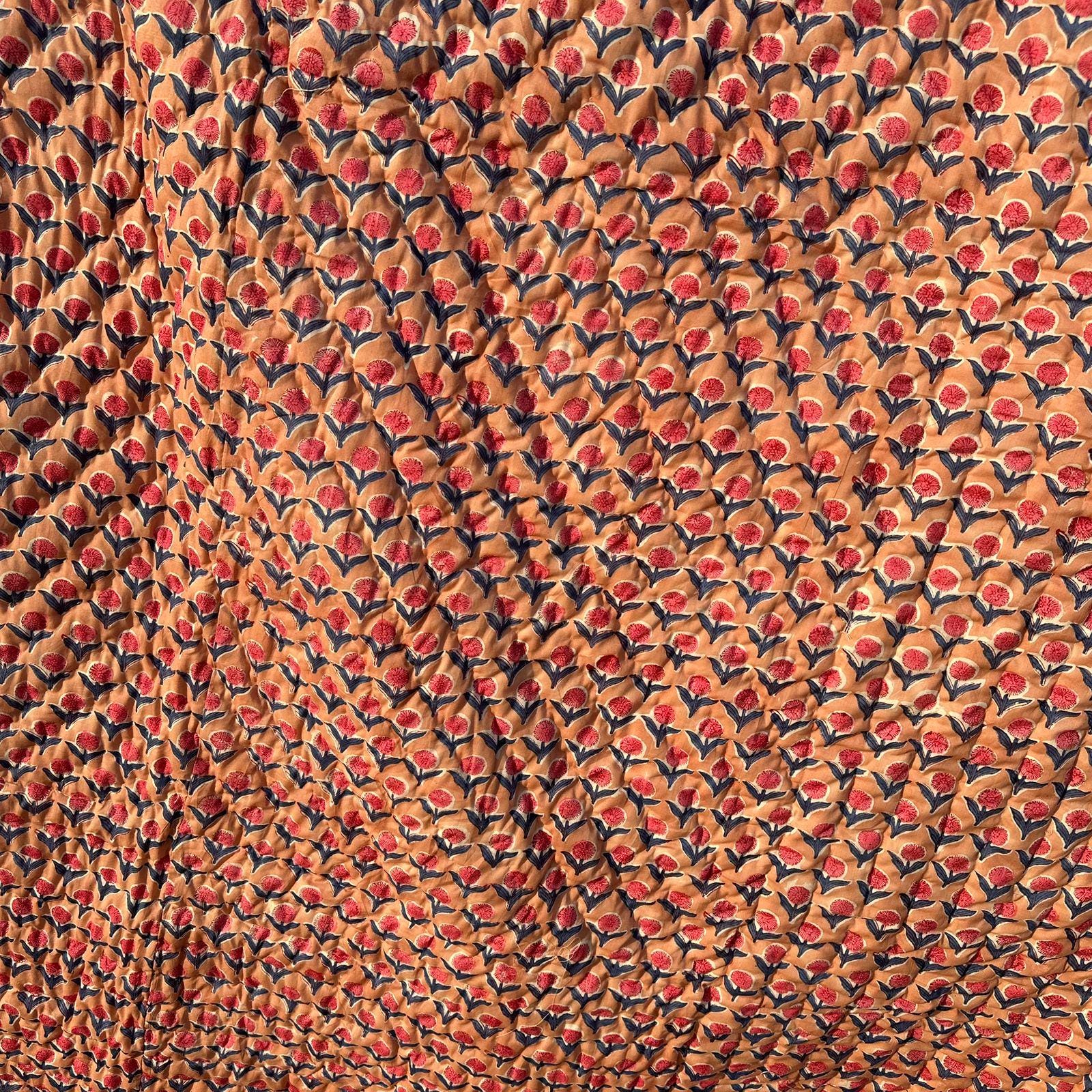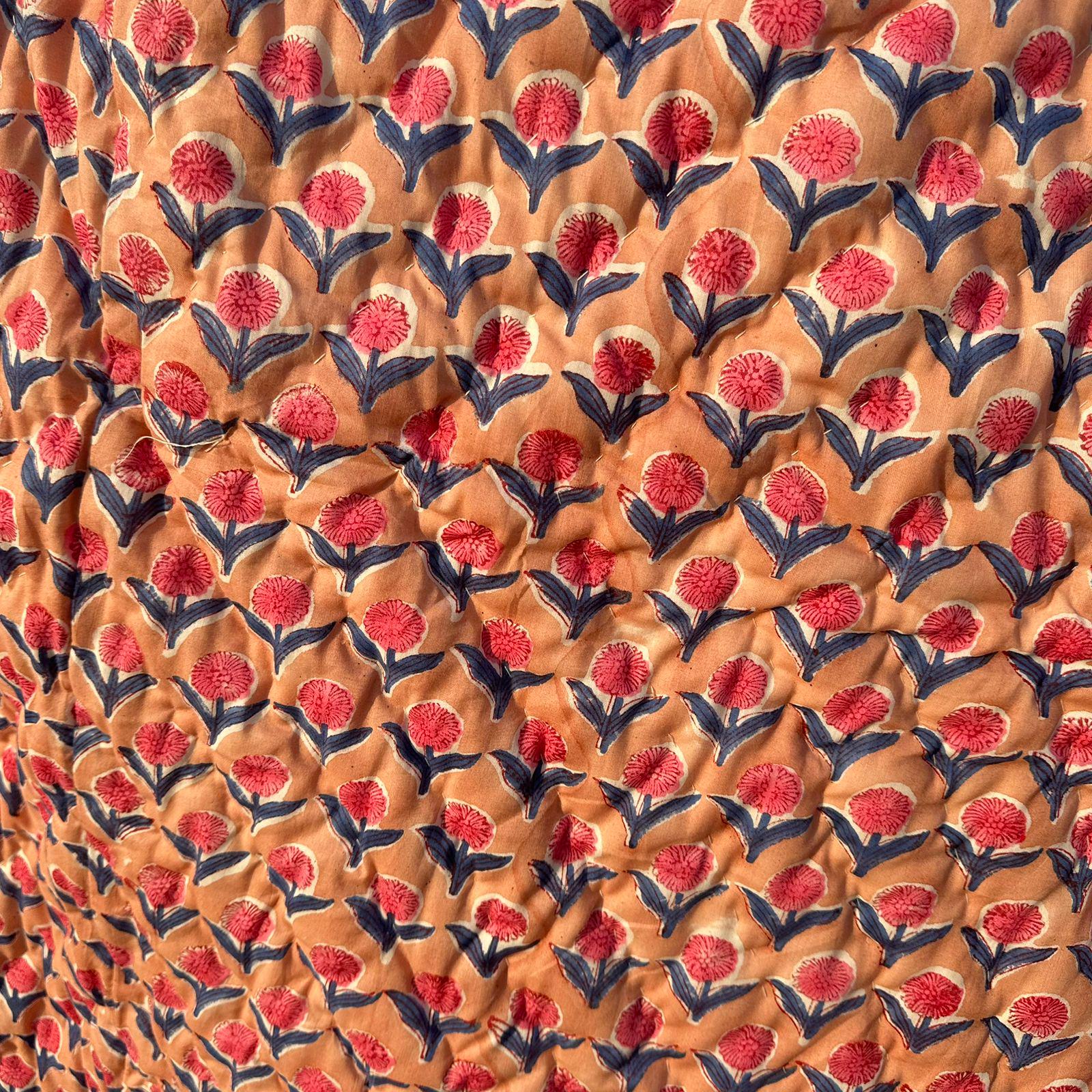 Wrap yourself in warmth and luxury with our Hand Block Printed Quilt, featuring intricate hand block printing on soft Malmal cotton fabric. Filled with natural loose cotton, it offers unparalleled comfort and coziness, perfect for colder seasons. Meticulously hand-stitched throughout, the quilt's unique design adds a touch of artistry and charm to your bedroom.