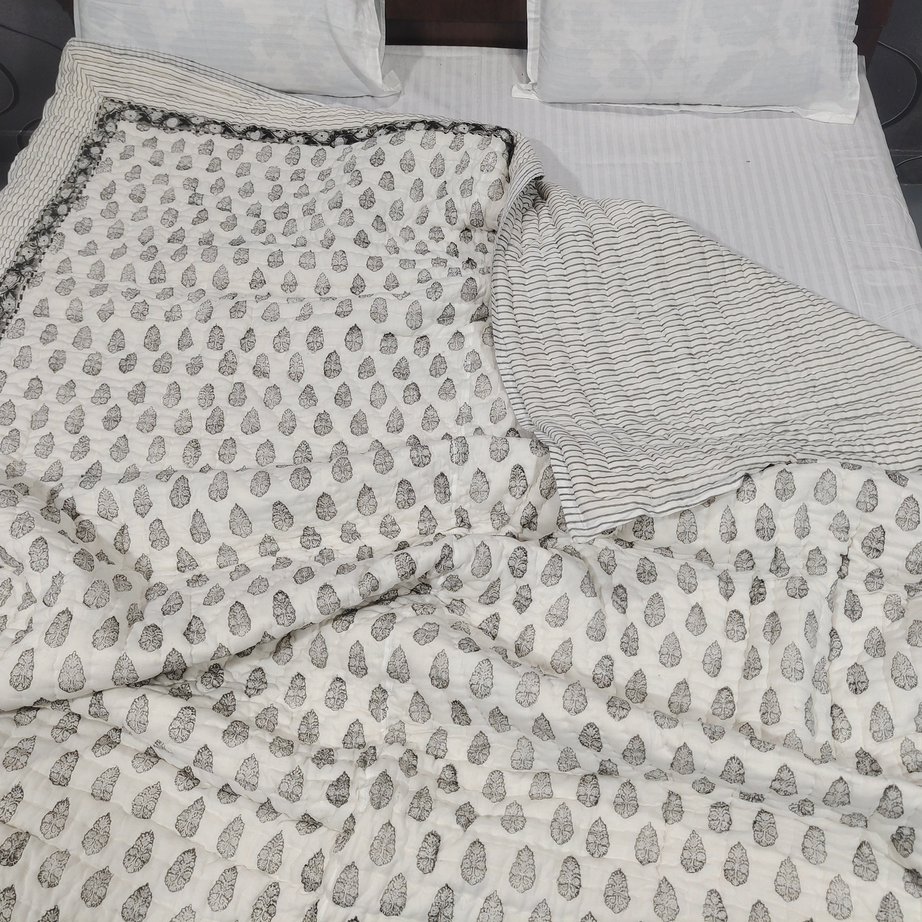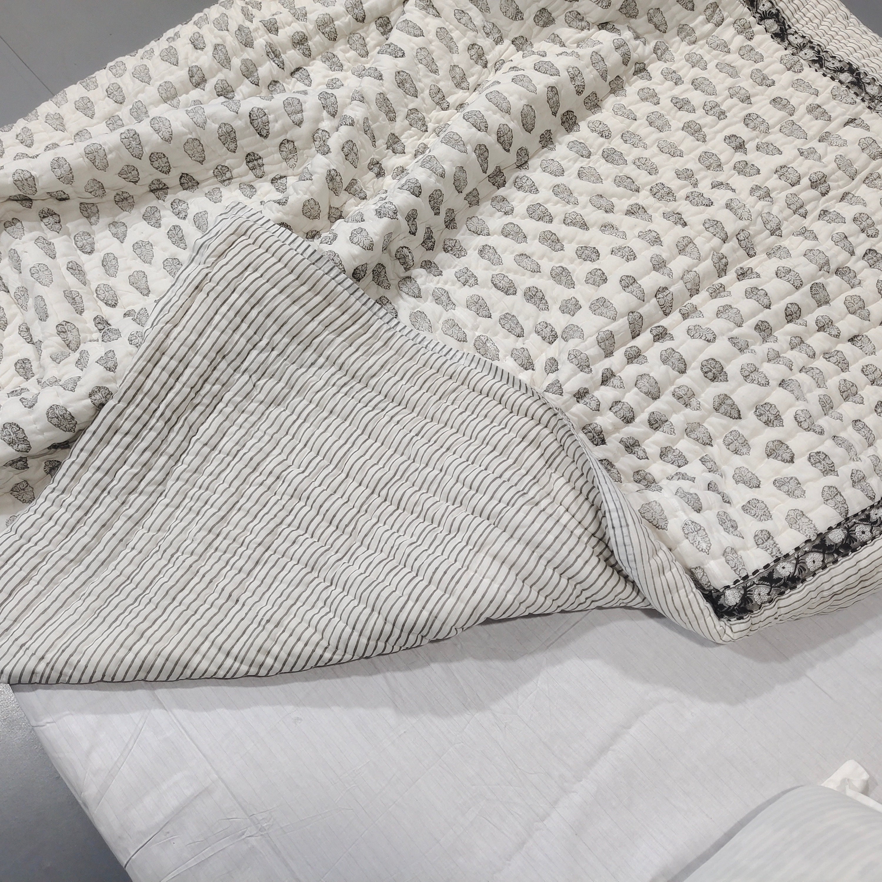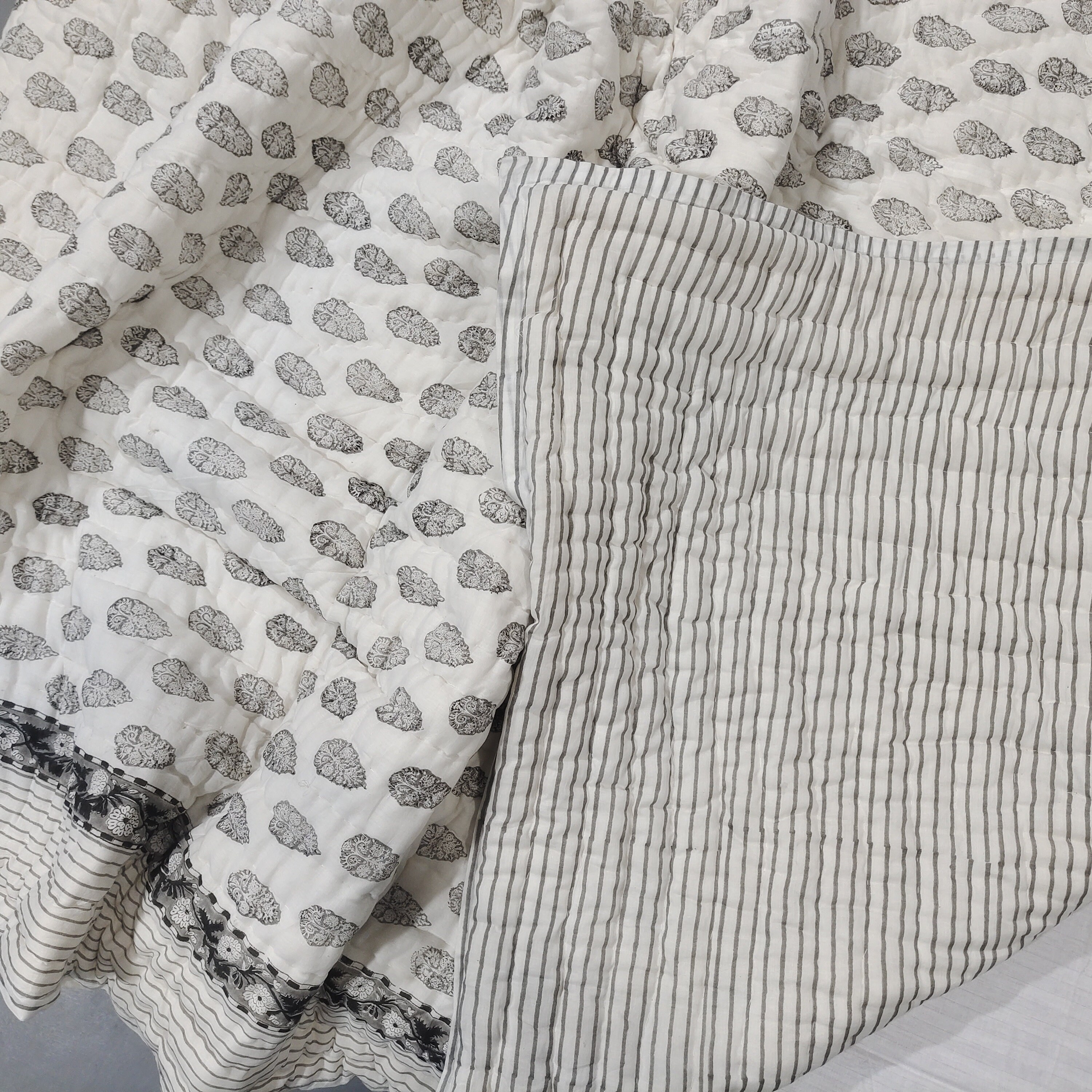 Hand Block Printed Cotton Quilt: Grey & White Bedspread
