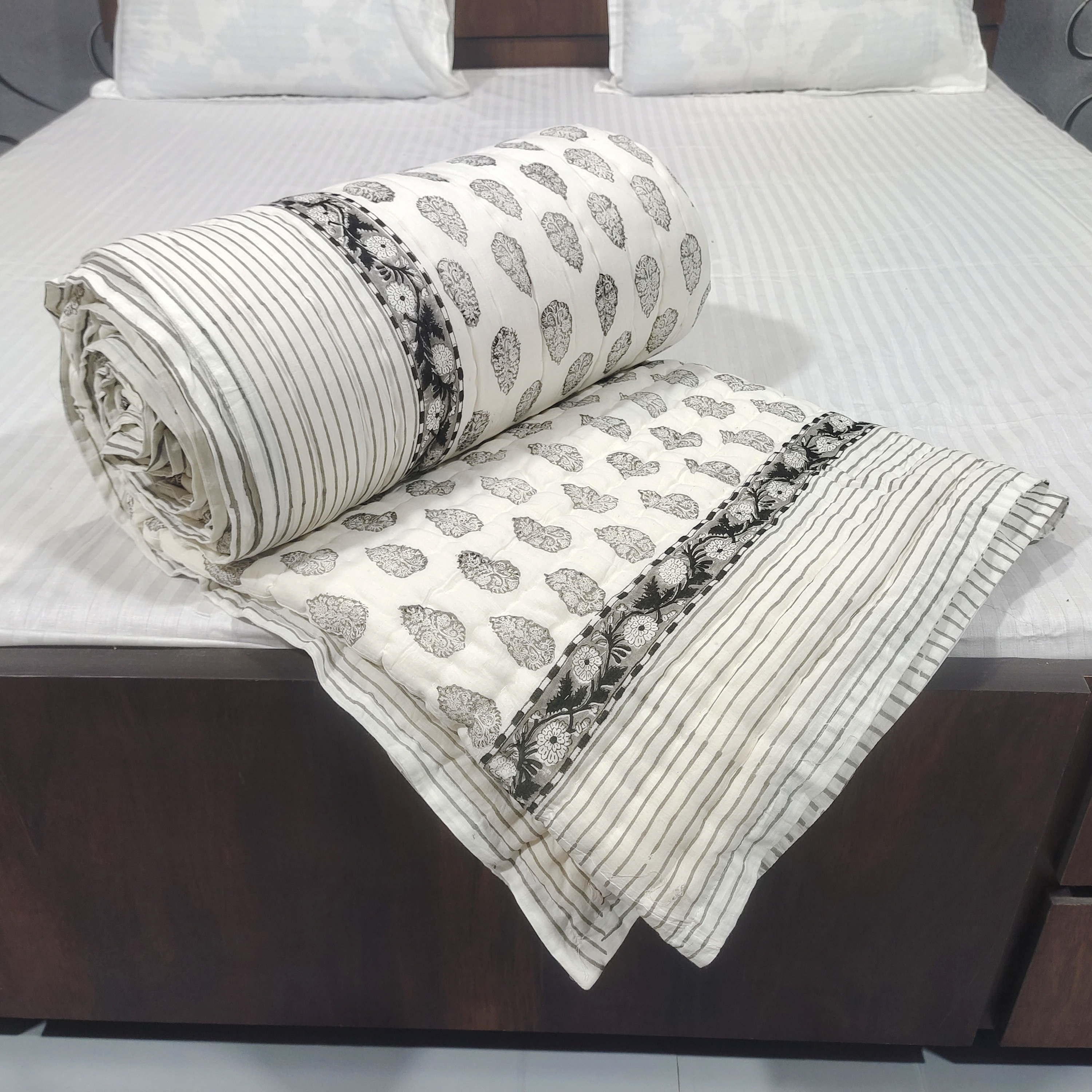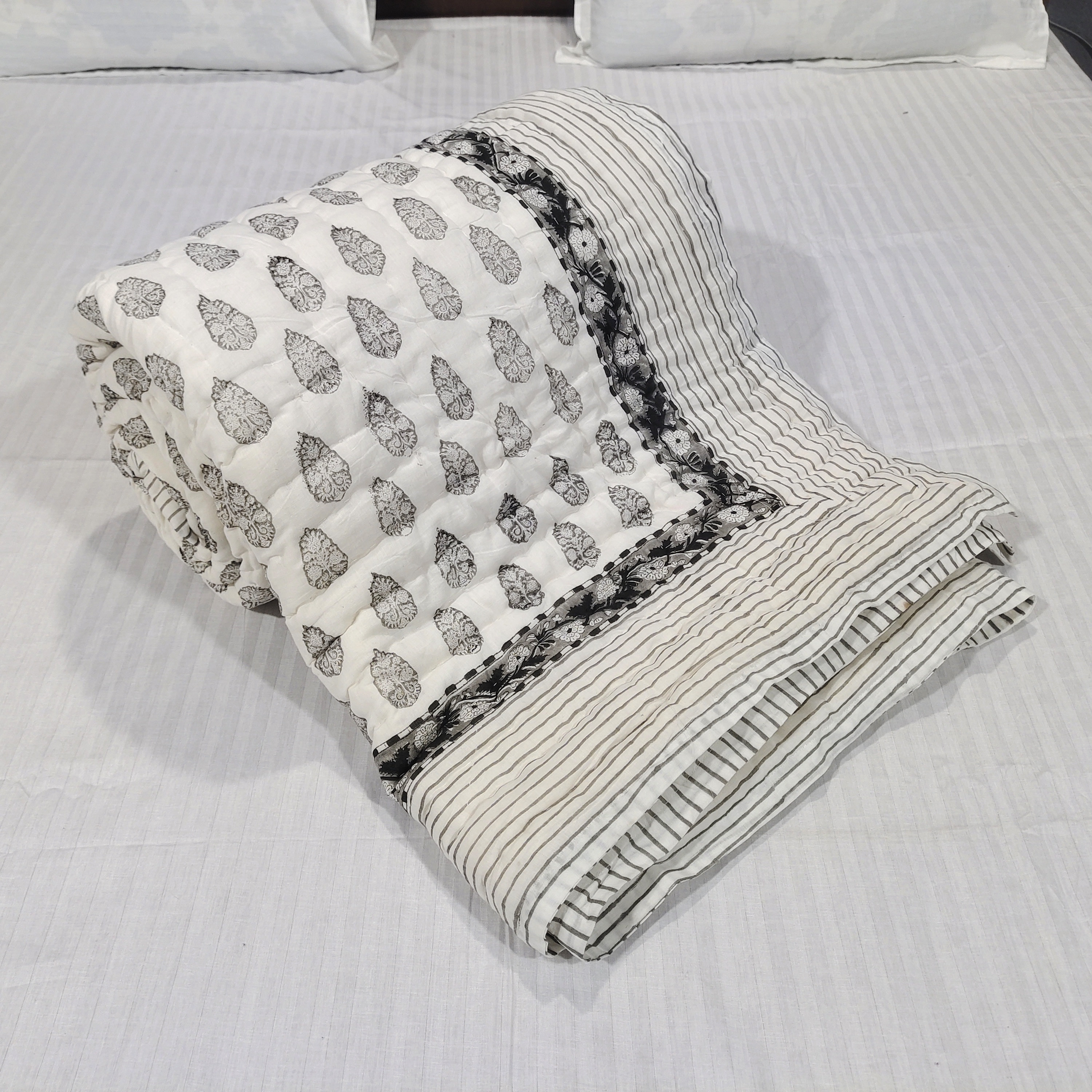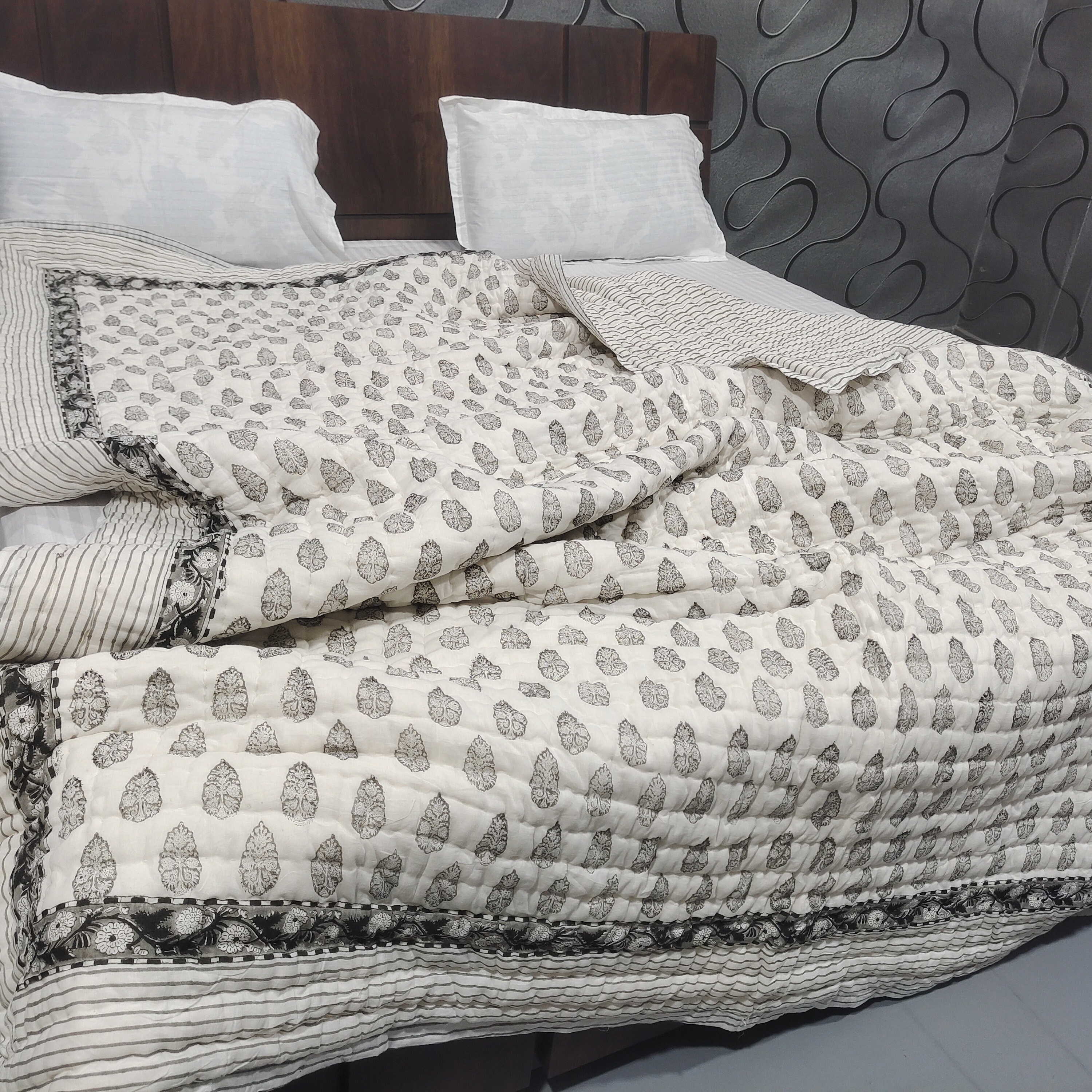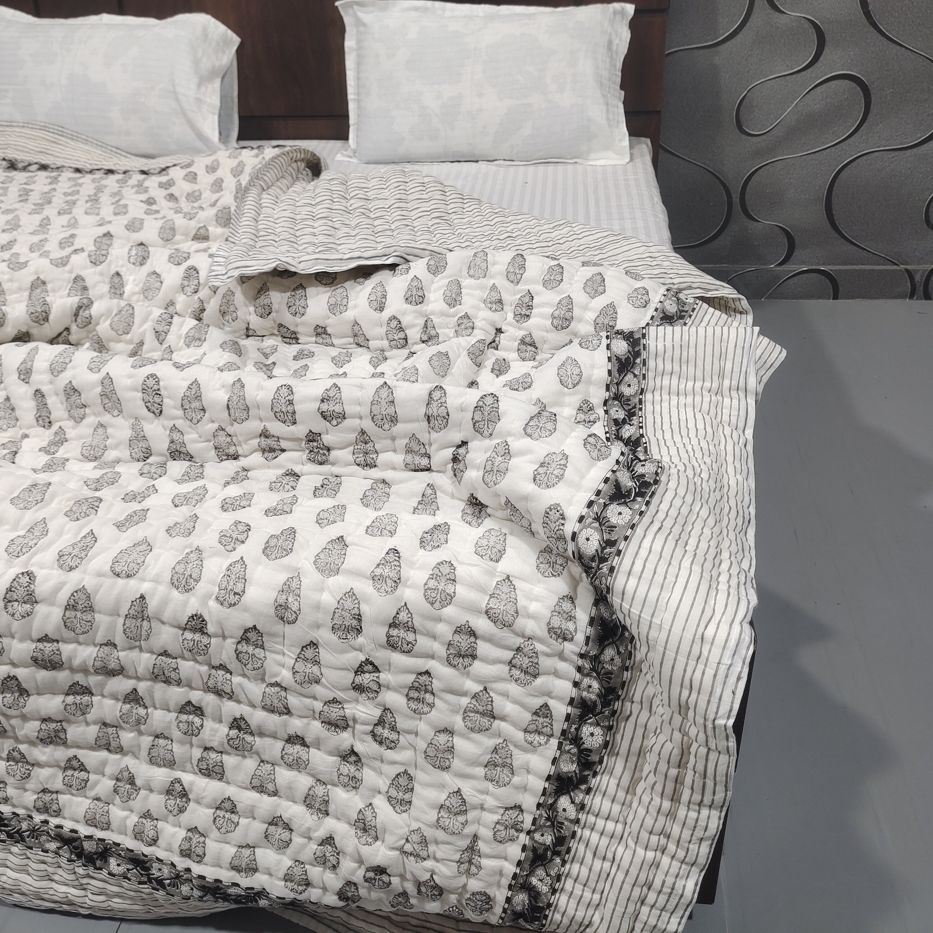 Hand Block Printed Cotton Quilt: Grey & White Bedspread