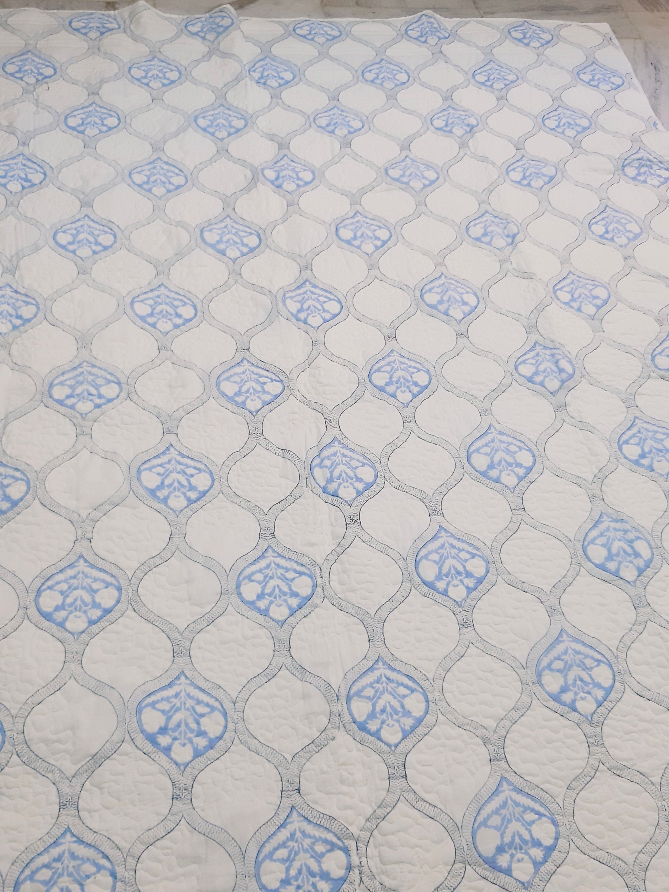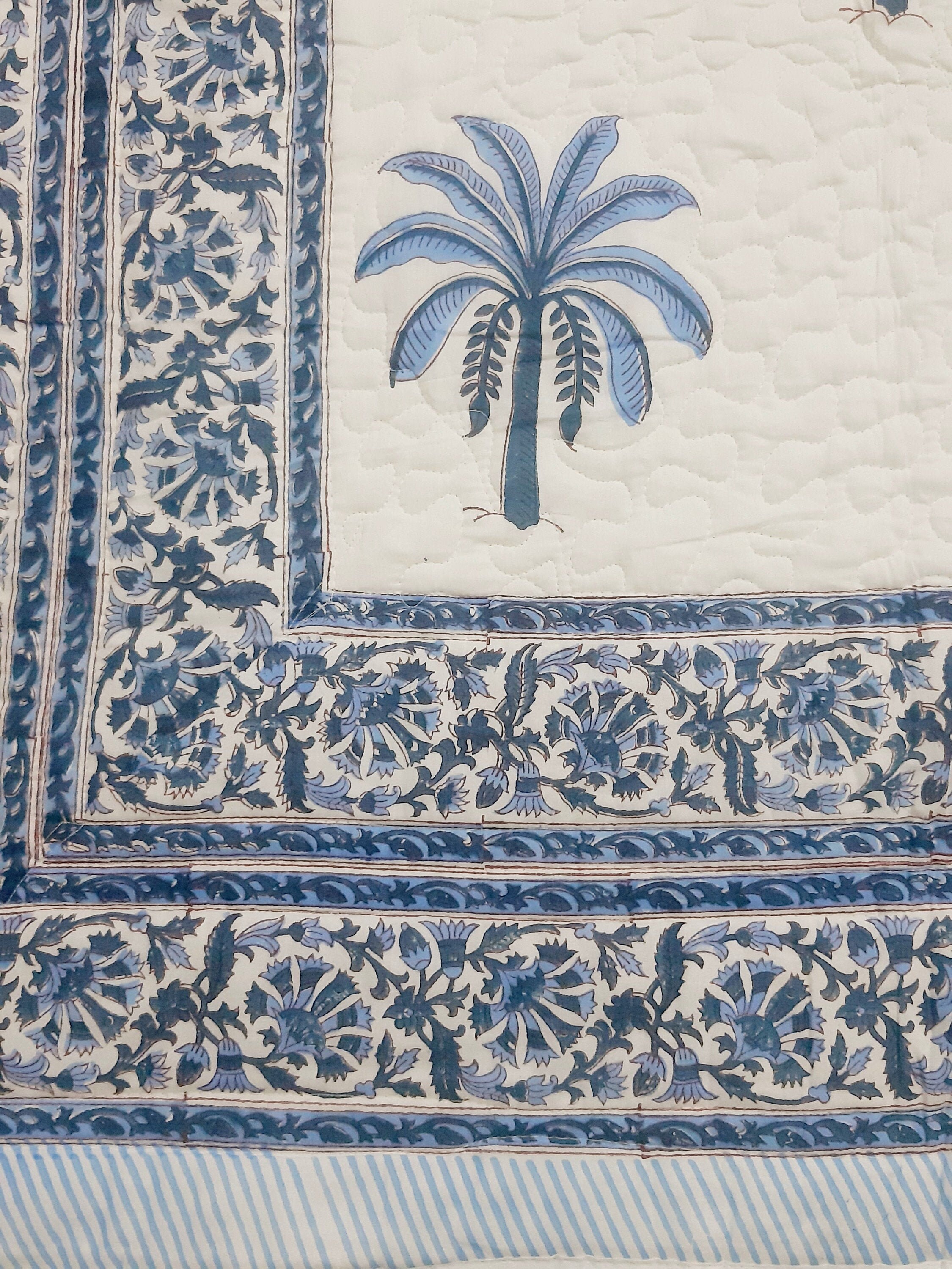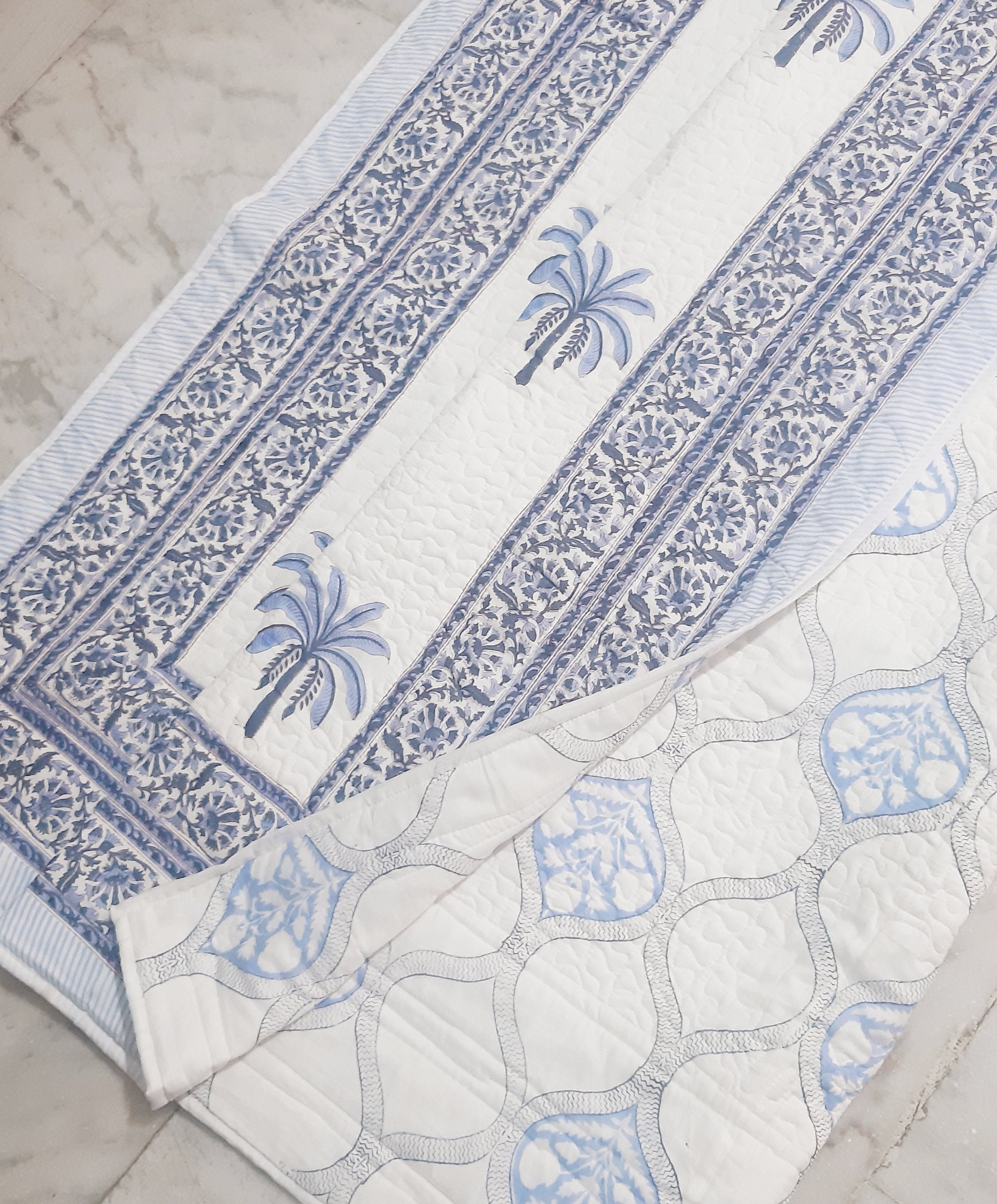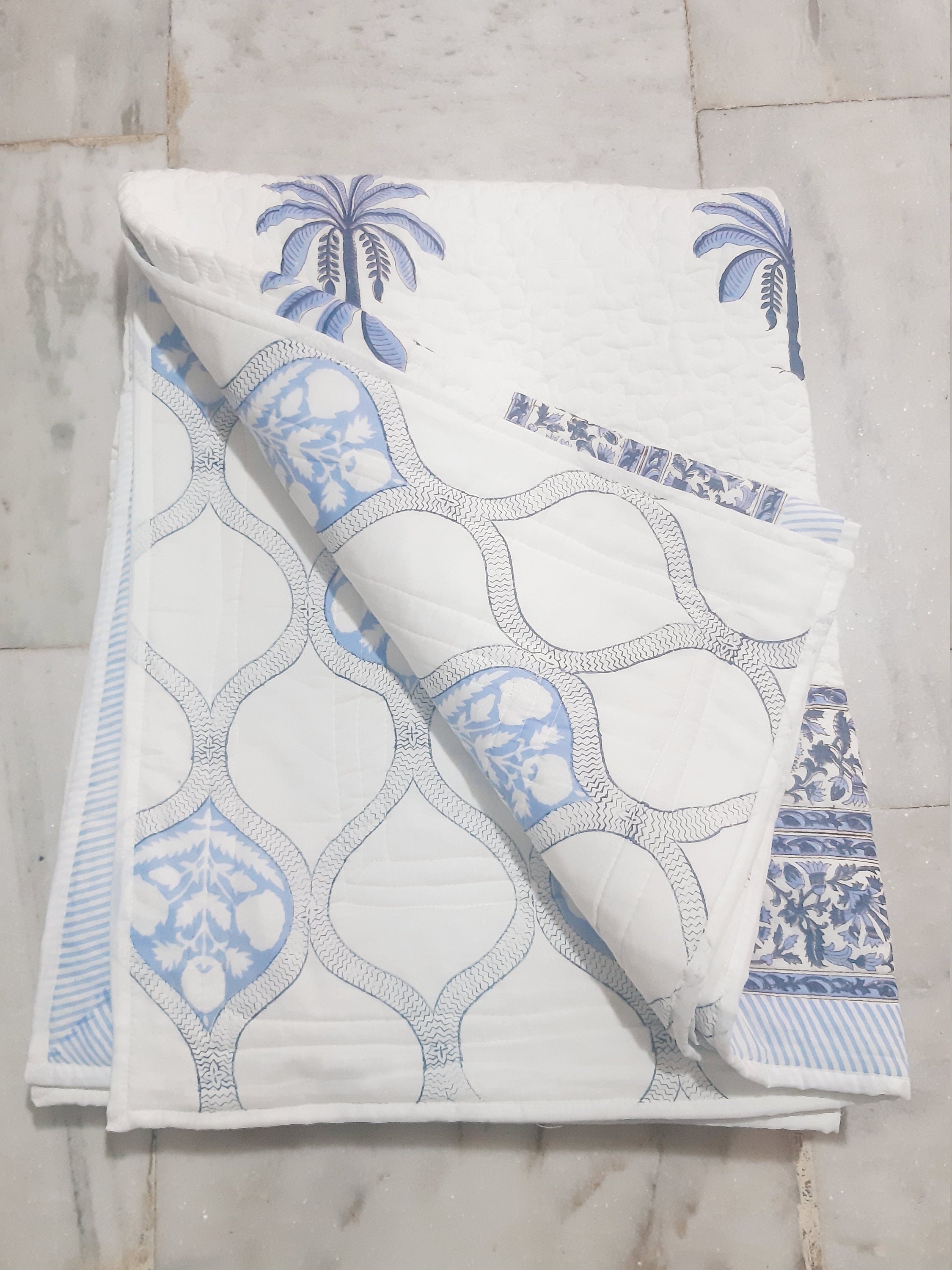 One distinctive feature of this quilt is its reversible hand block print. This traditional printing technique adds a unique and artistic touch to the quilt, making it not only a functional bedding item but also a piece of aesthetic appeal. Hand block printing involves skilled artisans carving intricate designs onto wooden blocks, which are then dipped in dye and stamped onto the fabric.