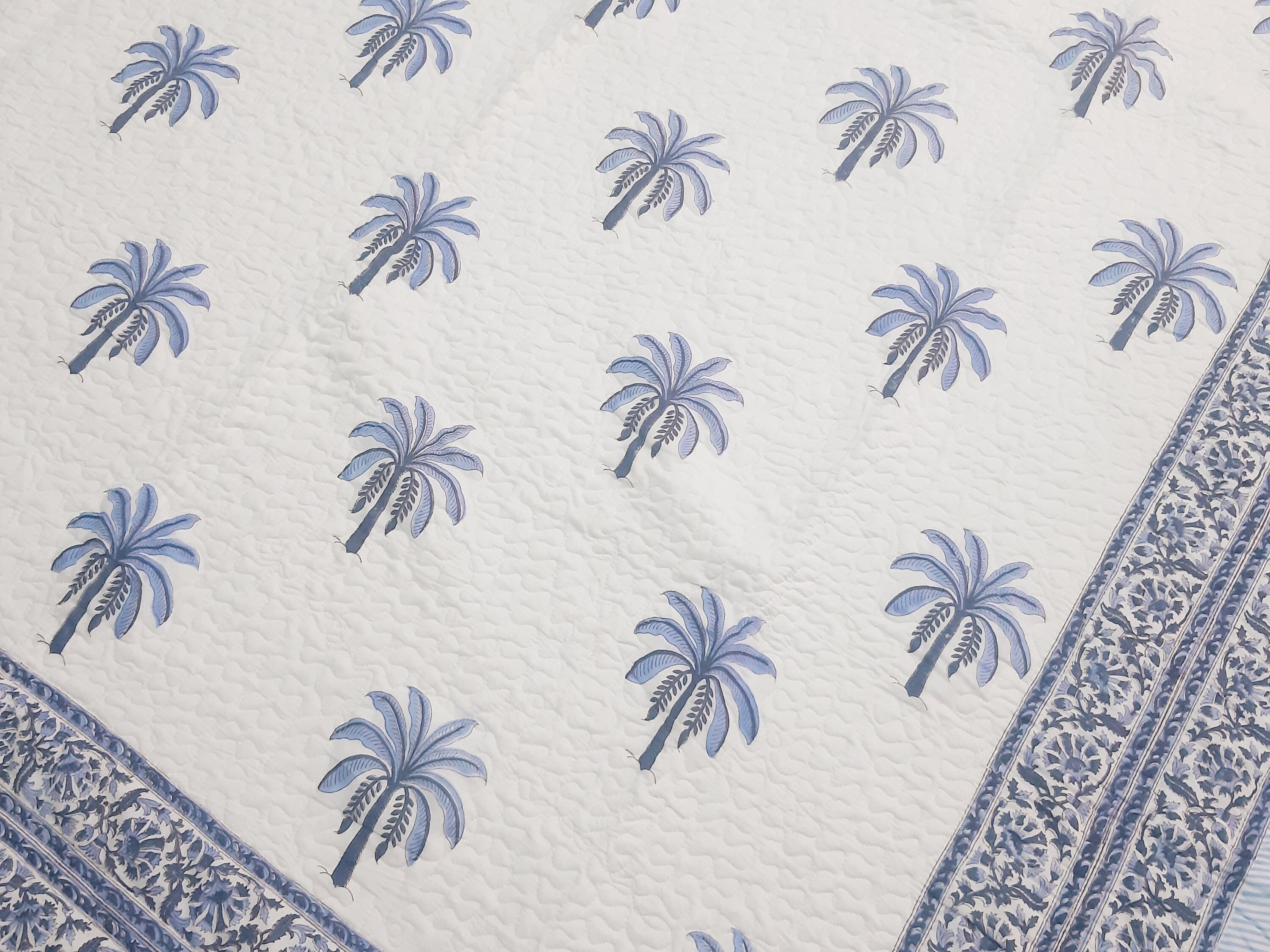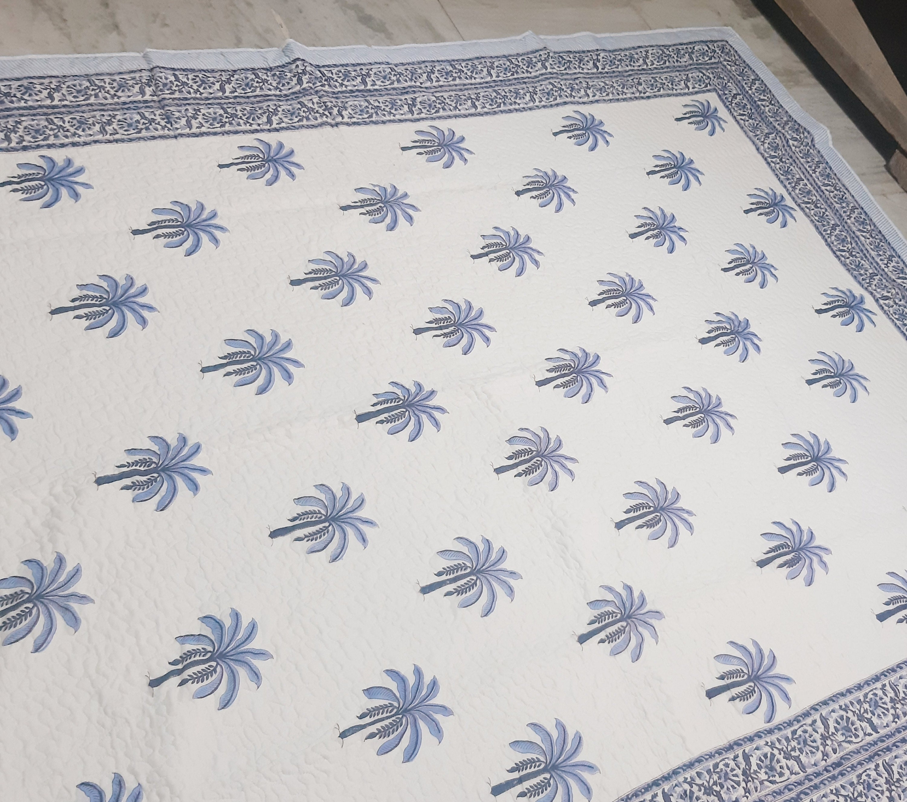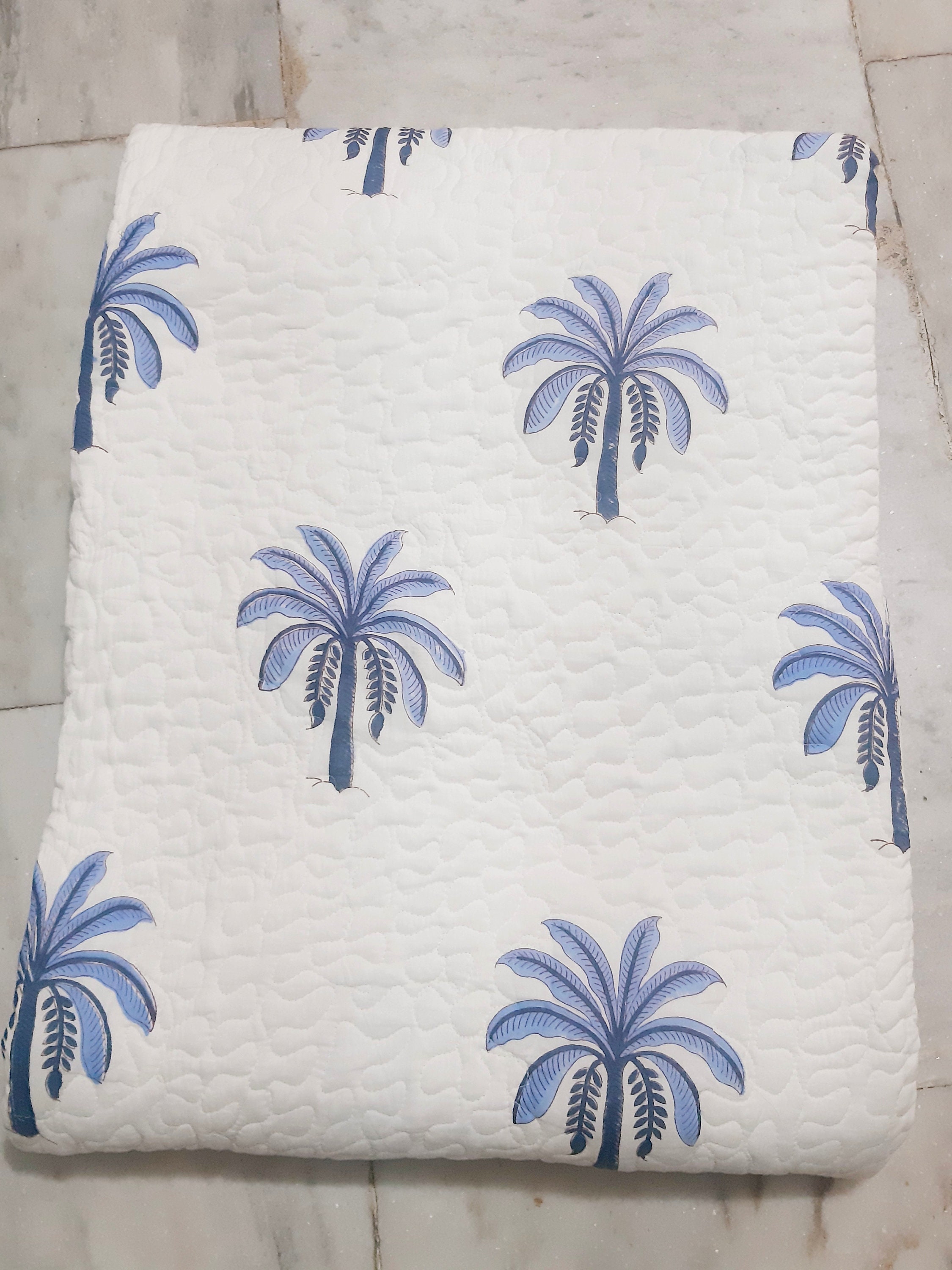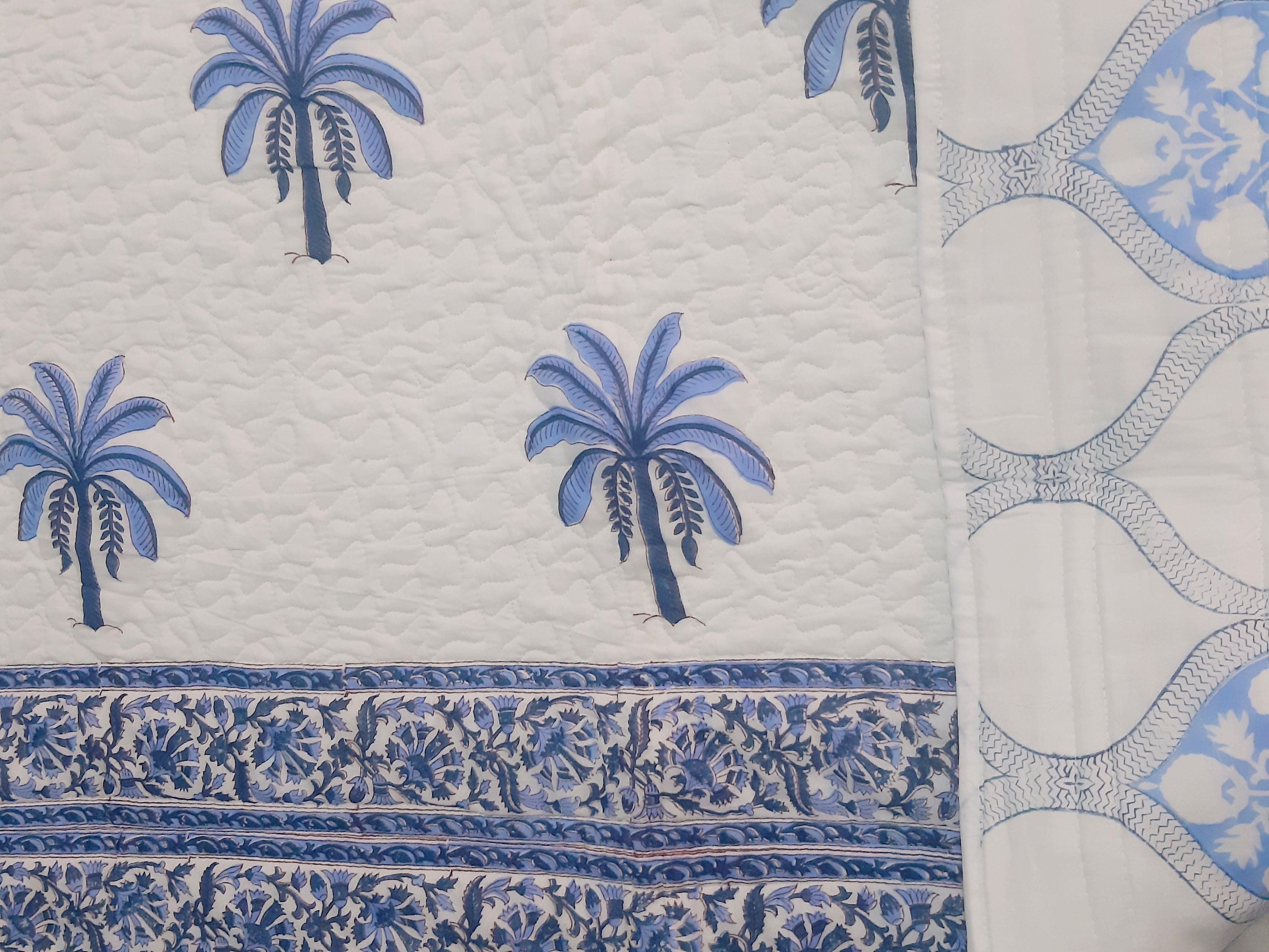 One distinctive feature of this quilt is its reversible hand block print. This traditional printing technique adds a unique and artistic touch to the quilt, making it not only a functional bedding item but also a piece of aesthetic appeal. Hand block printing involves skilled artisans carving intricate designs onto wooden blocks, which are then dipped in dye and stamped onto the fabric.