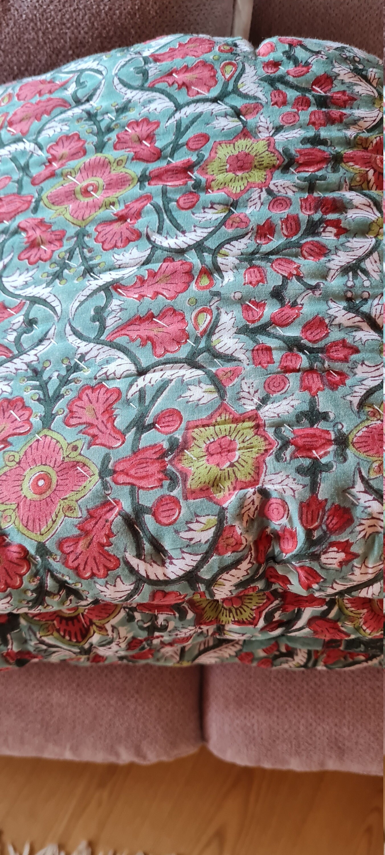Die Decke ist sehr schön, es ist schon die 2. die ich in diesem Shop bestelle. Leider passt diesmal die Farbe nicht. Ich verkaufe sie original gerollt innerhalb EU um 100€ unter diesem Link: https://www.willhaben.at/iad/kaufen-und-verkaufen/d/handgemachte-baumwolldecke-wendedecke-handgenaehter-quilt-indischer-quiltwurf-indische-bettwaesche-tagesdecke-555188143/