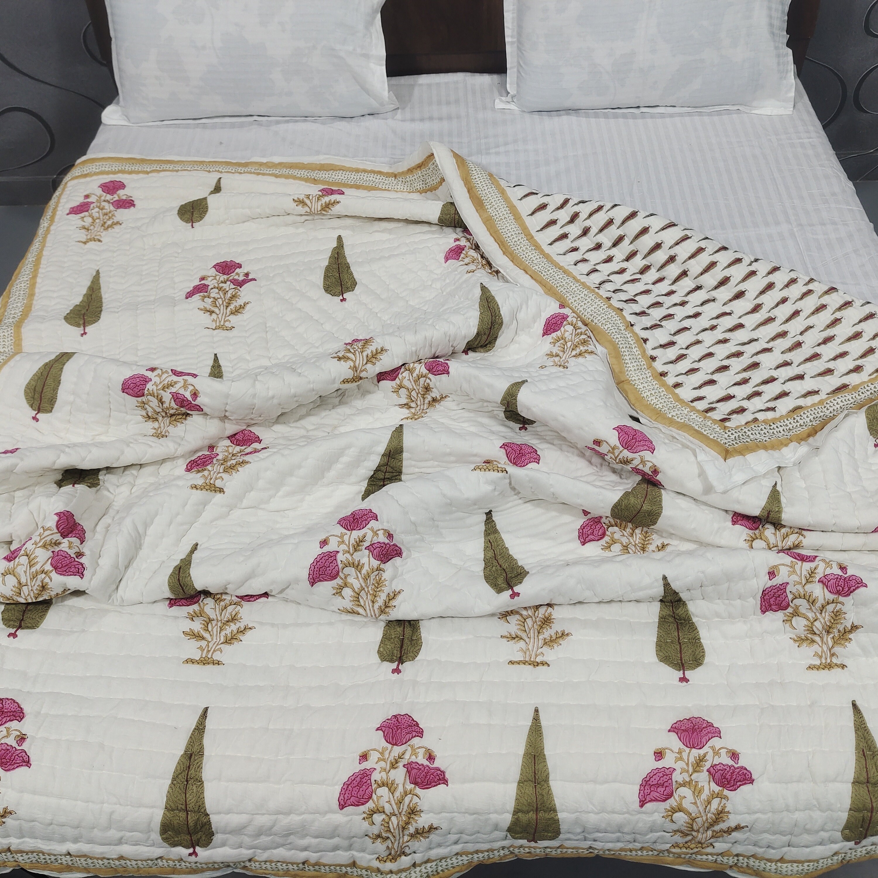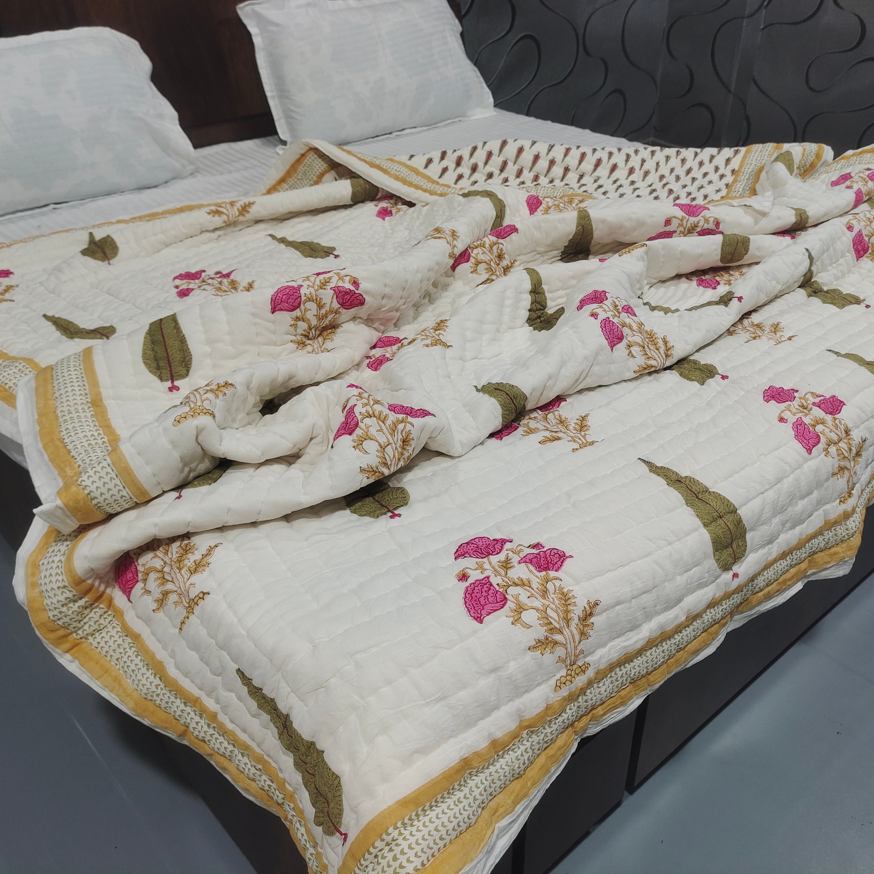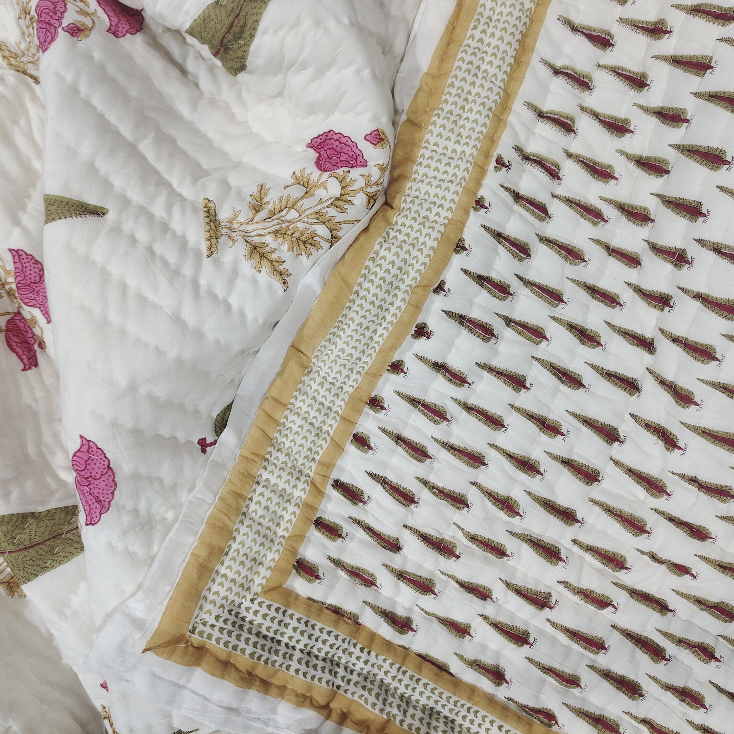 Floral Hand Block Print Cotton Quilt: Reversible Jaipuri Razai