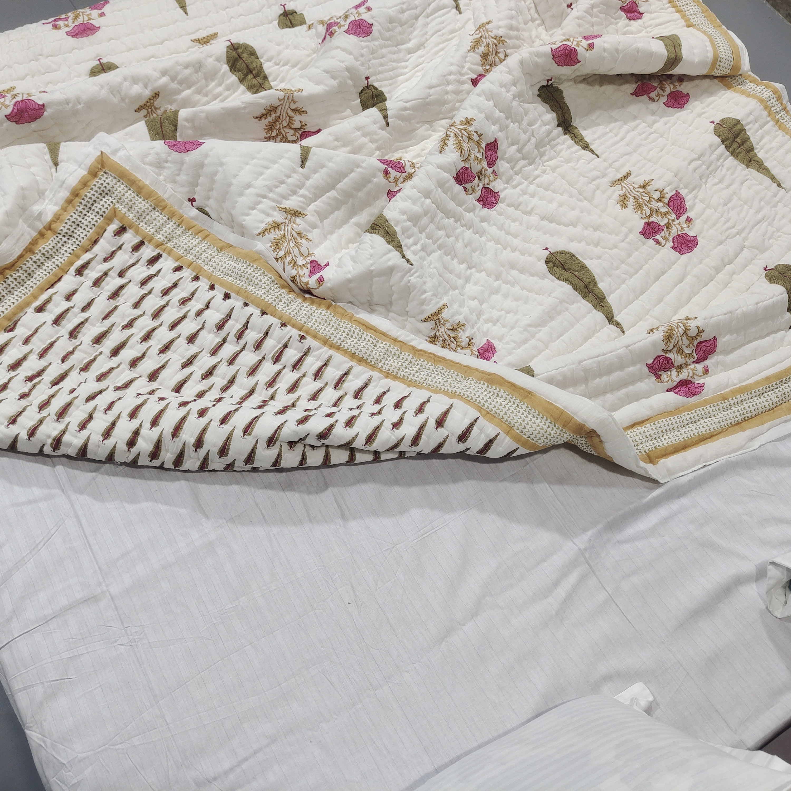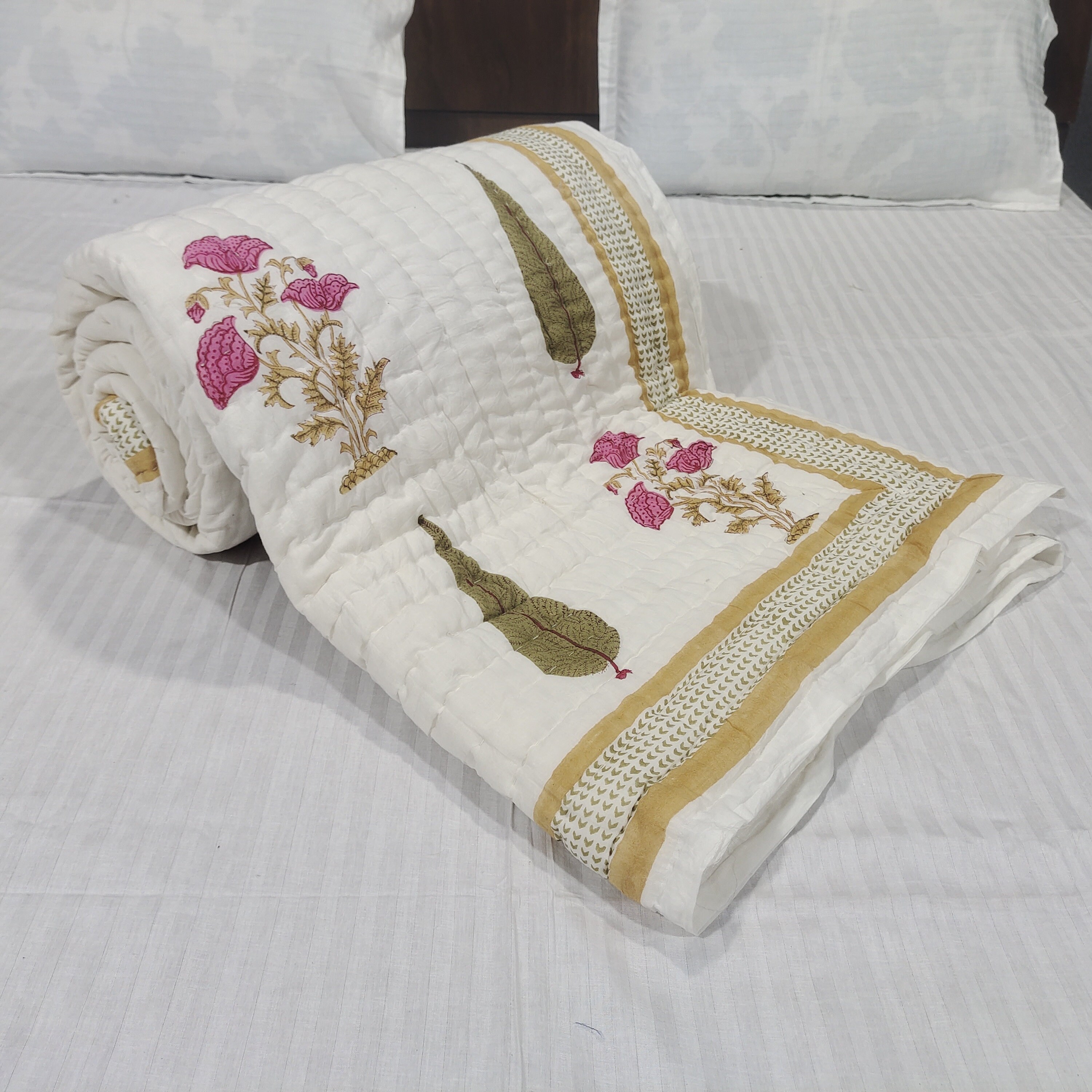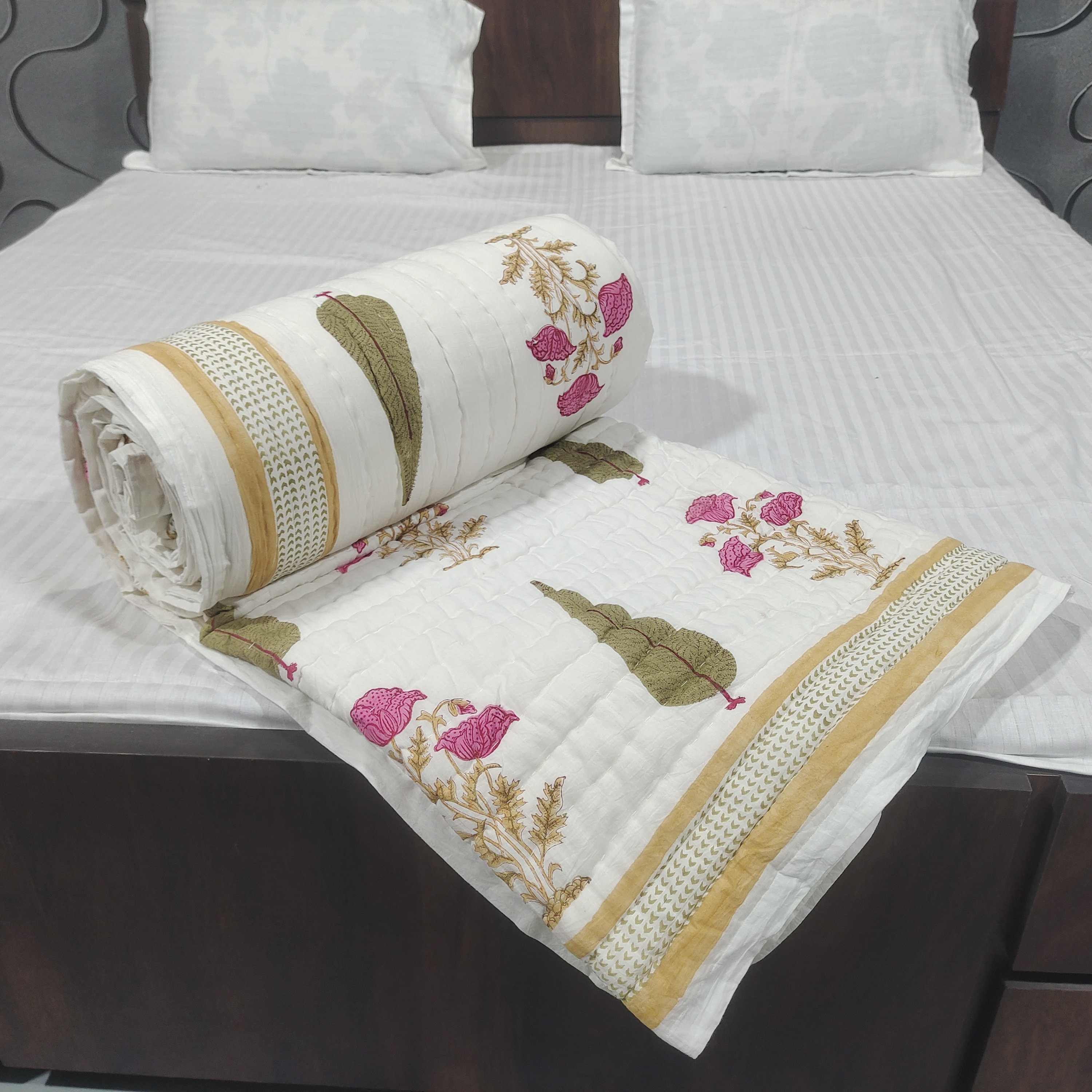 Floral Hand Block Print Cotton Quilt: Reversible Jaipuri Razai