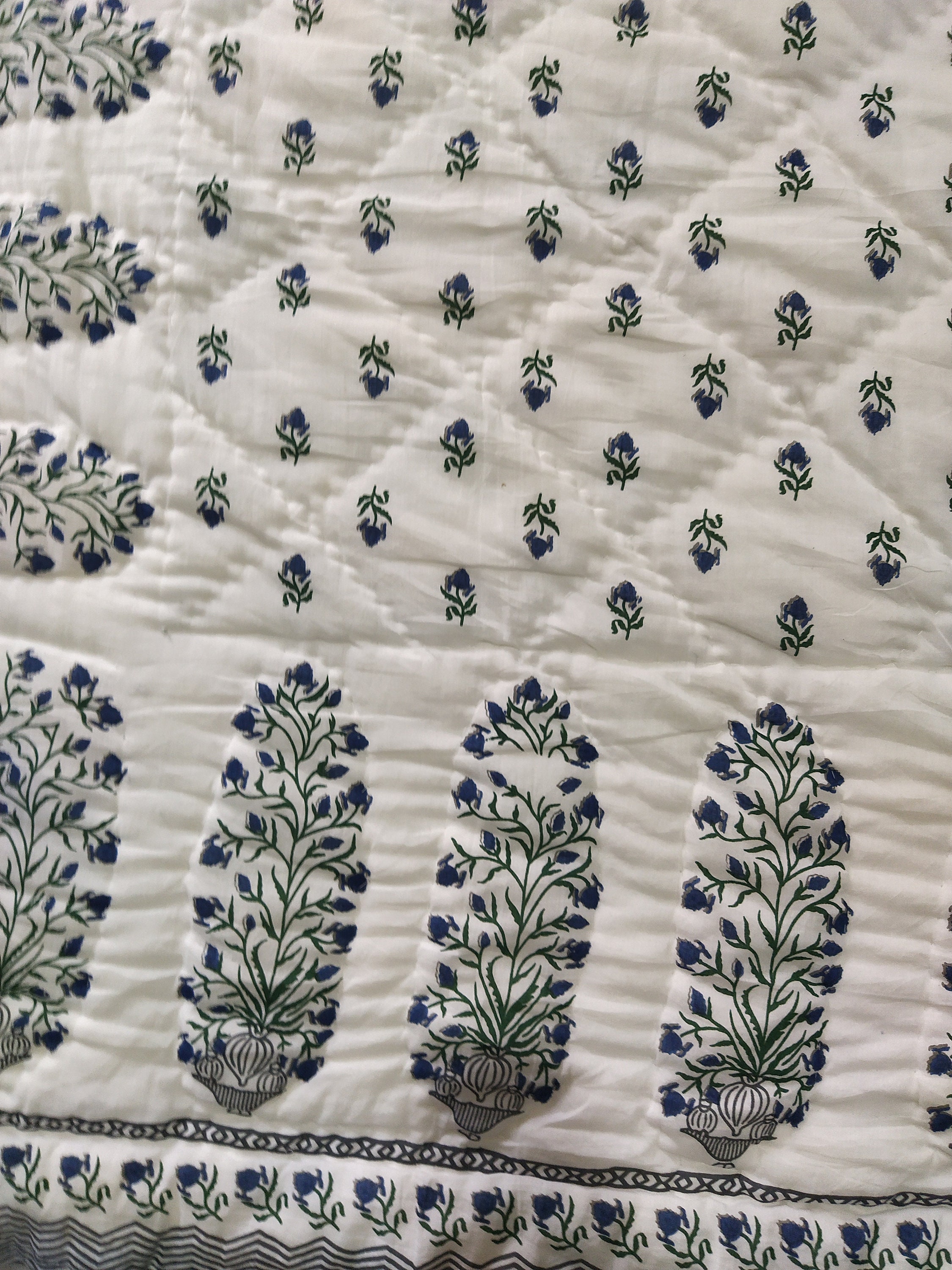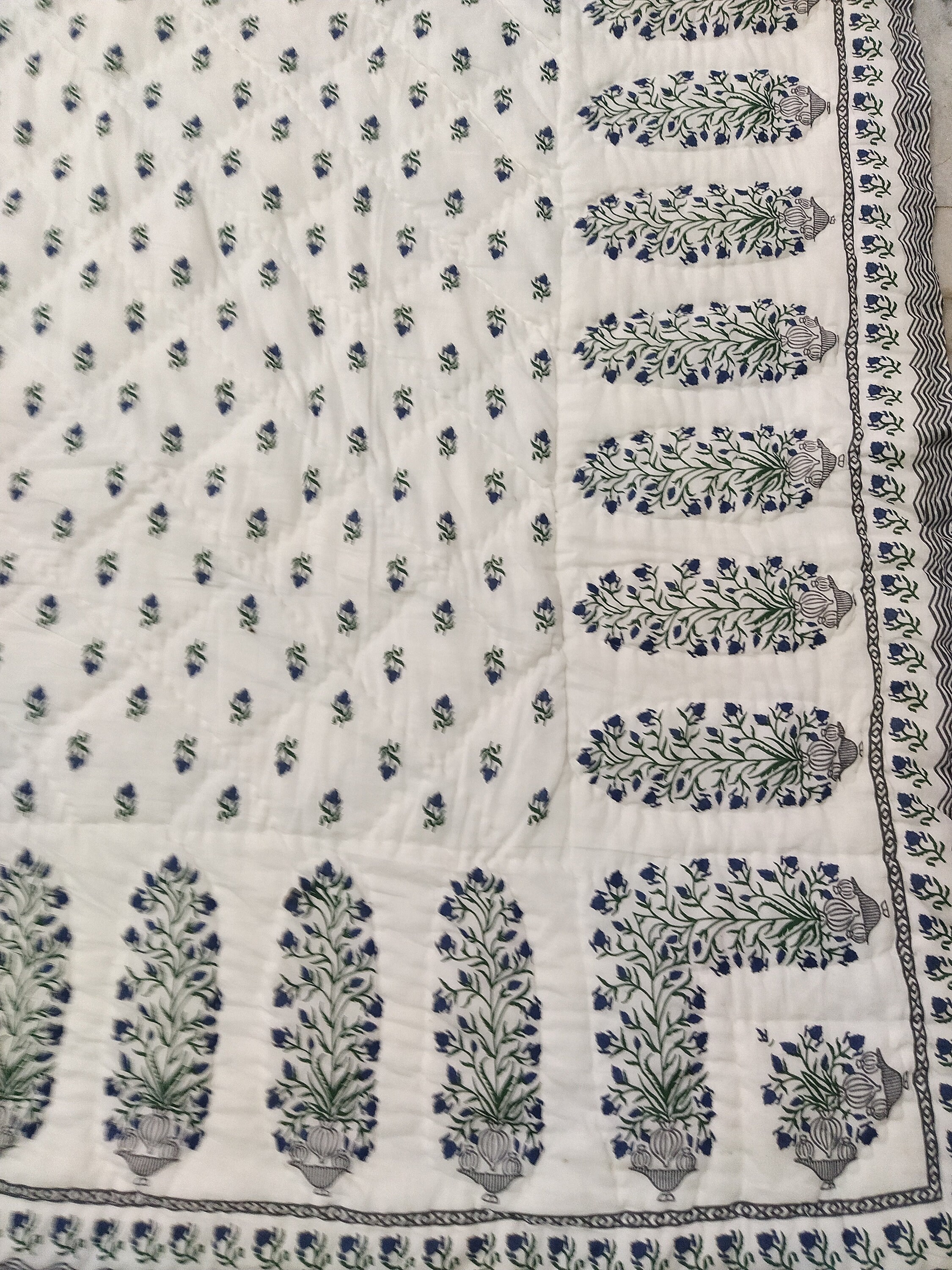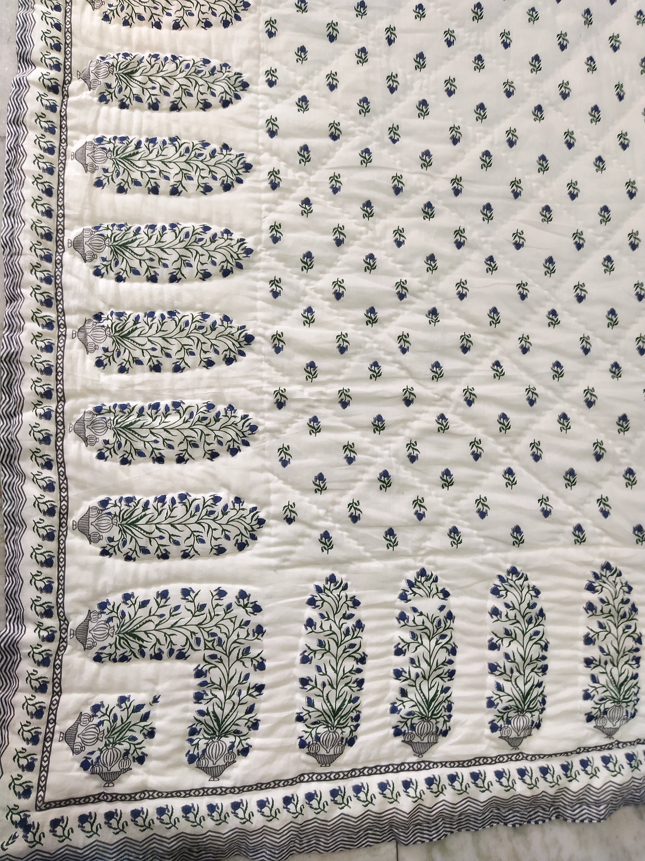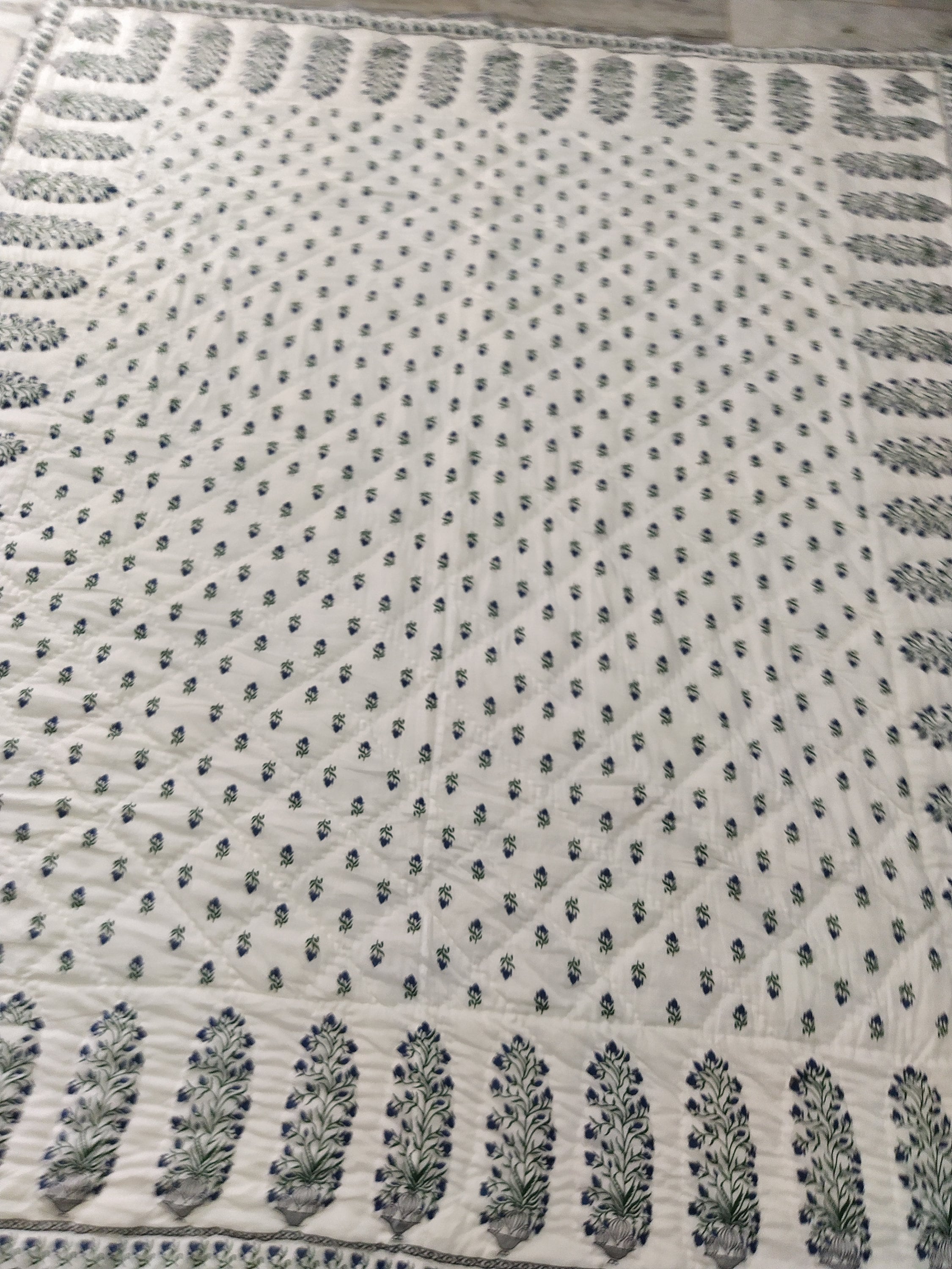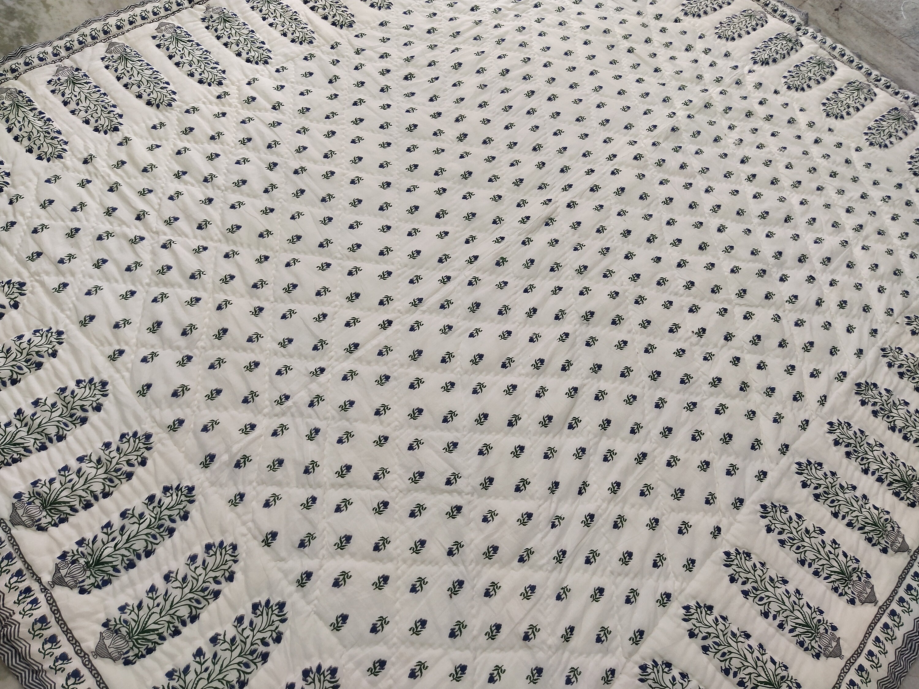 Indulge in the artistry of traditional craftsmanship with our exquisite Hand Stitched Hand Block Print Quilt. Each quilt is a masterpiece of skill and creativity, meticulously crafted by skilled artisans in Jaipur, India. From the intricate hand block printing to the careful stitching, every step in the process is a labor of love, resulting in a quilt that's as beautiful as it is functional.