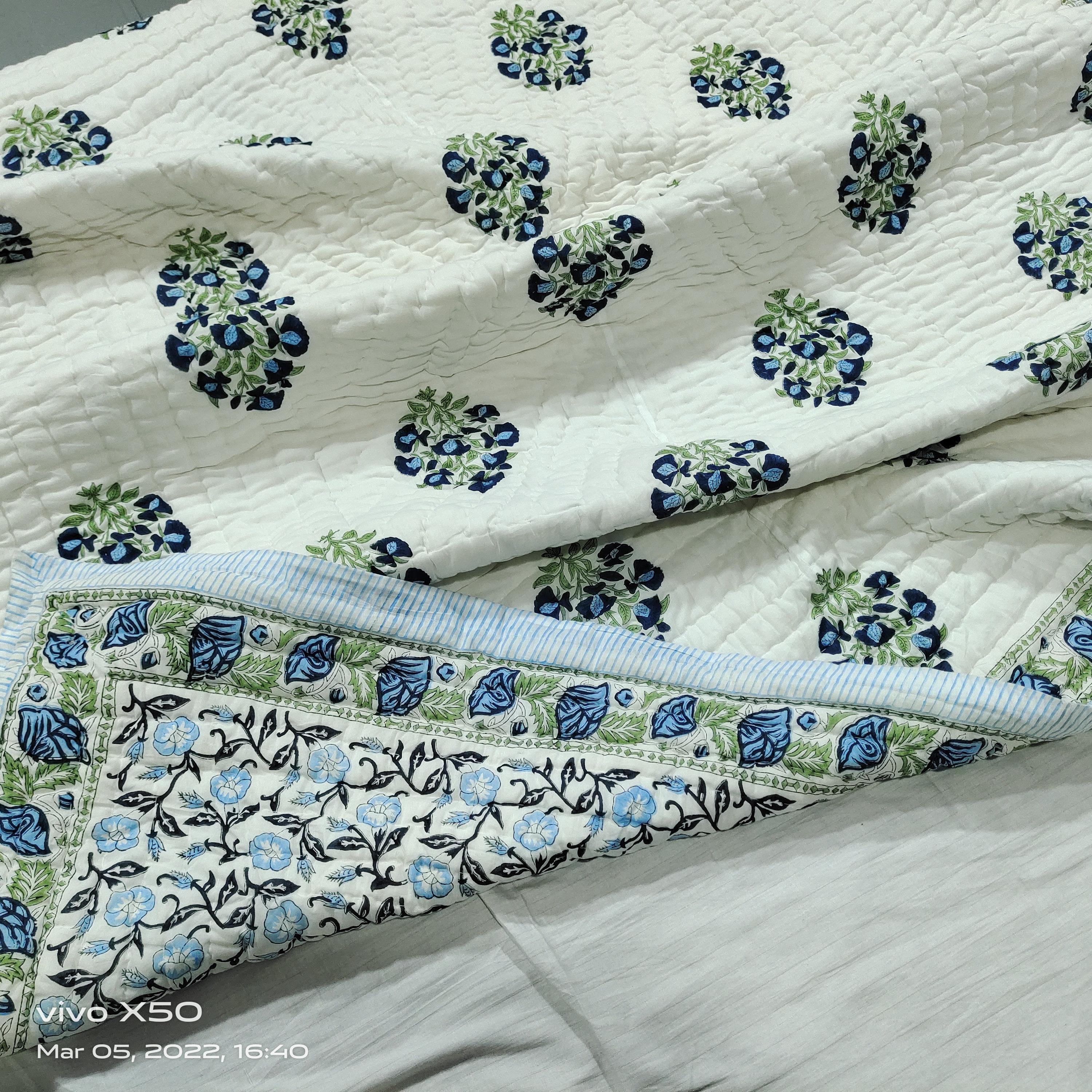 Hand Block Print Cotton Queen Quilt: Reversible Floral Bedding (90x108)