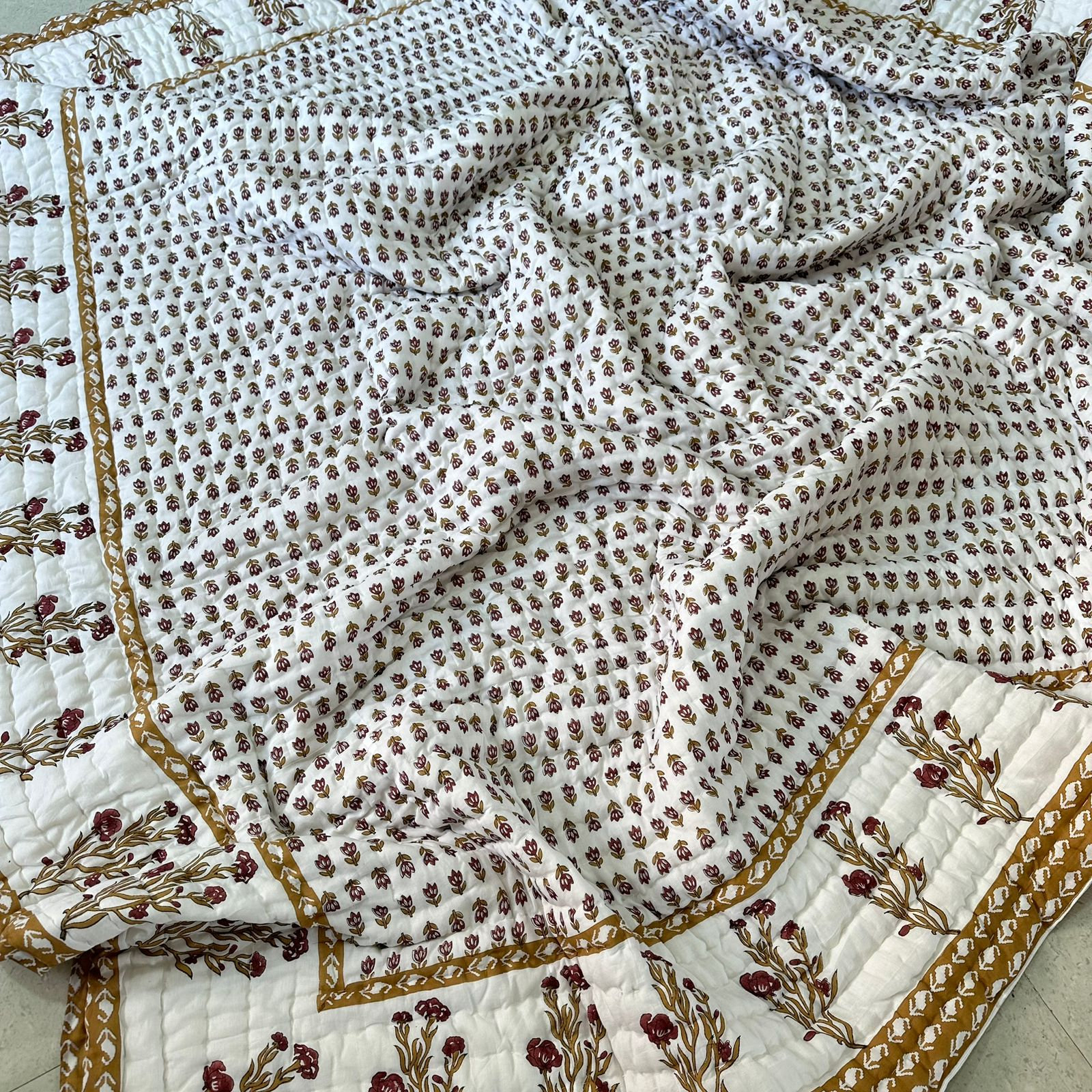 Wrap yourself in warmth and luxury with our Hand Block Printed Quilt, featuring intricate hand block printing on soft Malmal cotton fabric. Filled with natural loose cotton, it offers unparalleled comfort and coziness, perfect for colder seasons. Meticulously hand-stitched throughout, the quilt's unique design adds a touch of artistry and charm to your bedroom.