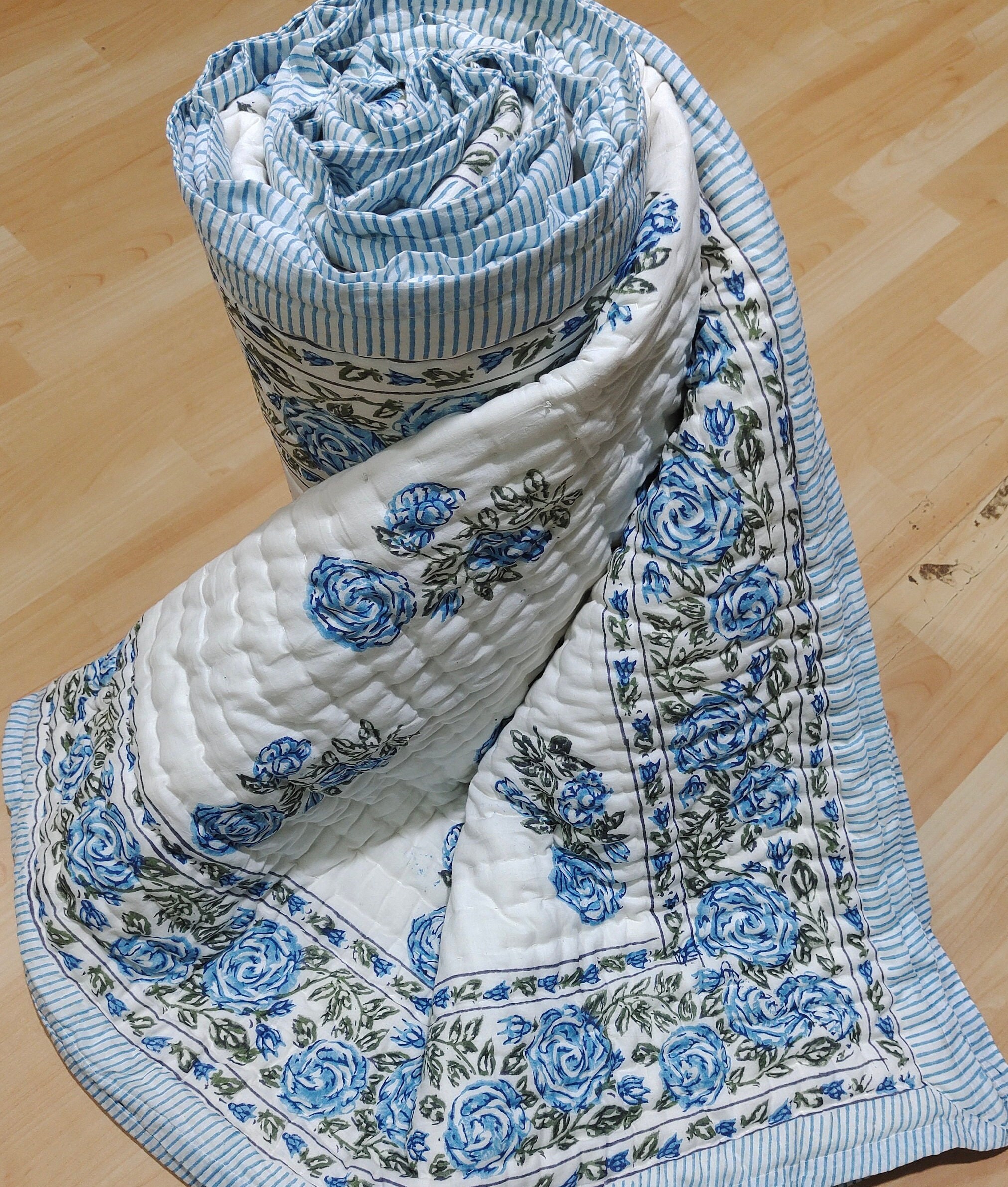 Indulge in the artistry of traditional craftsmanship with our exquisite Hand Stitched Hand Block Print Quilt. Each quilt is a masterpiece of skill and creativity, meticulously crafted by skilled artisans in Jaipur, India. From the intricate hand block printing to the careful stitching, every step in the process is a labor of love, resulting in a quilt that's as beautiful as it is functional.